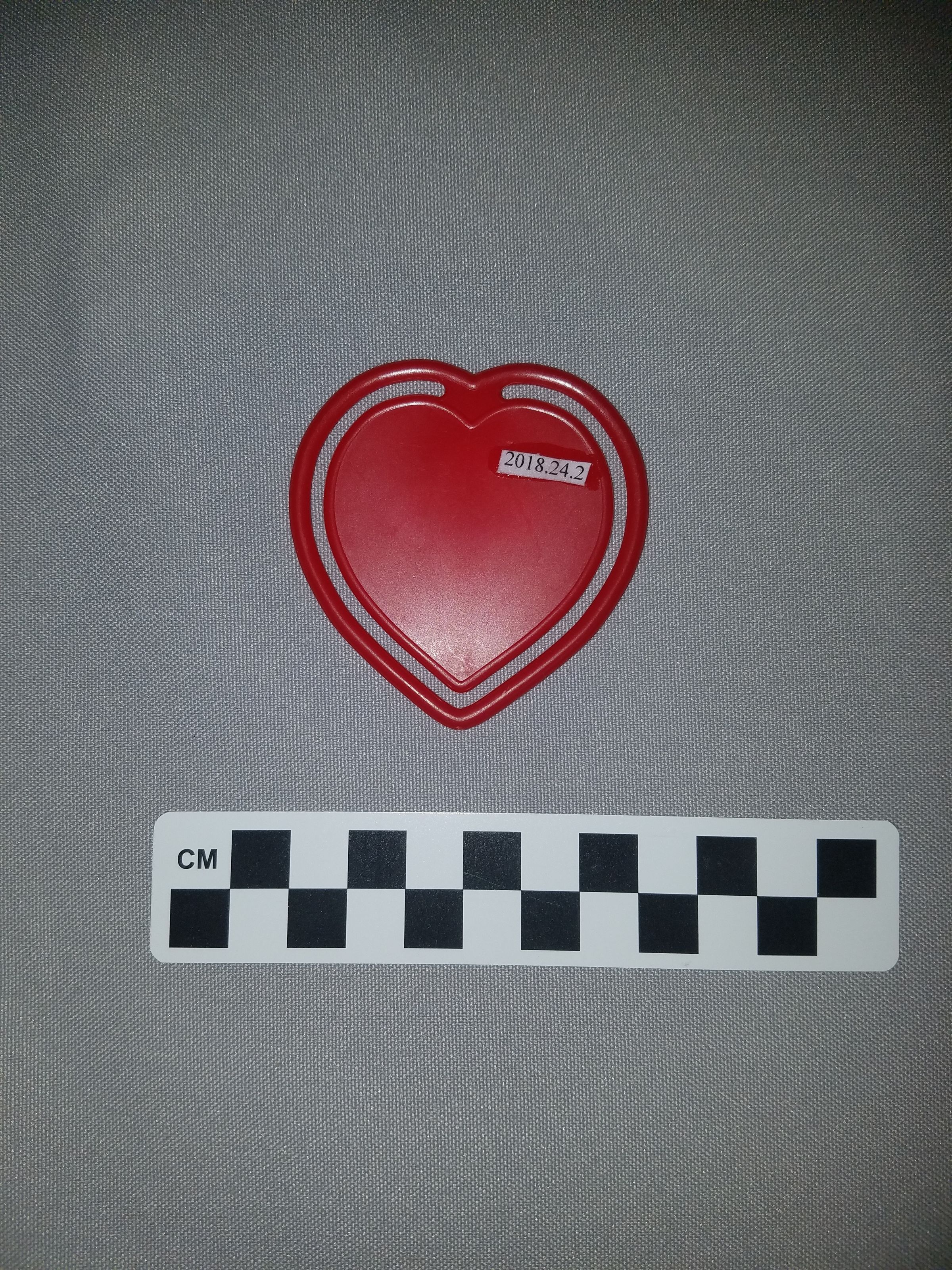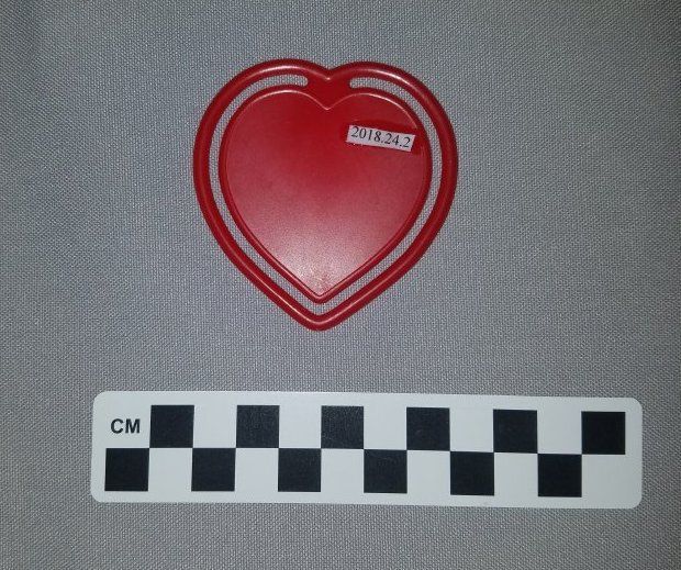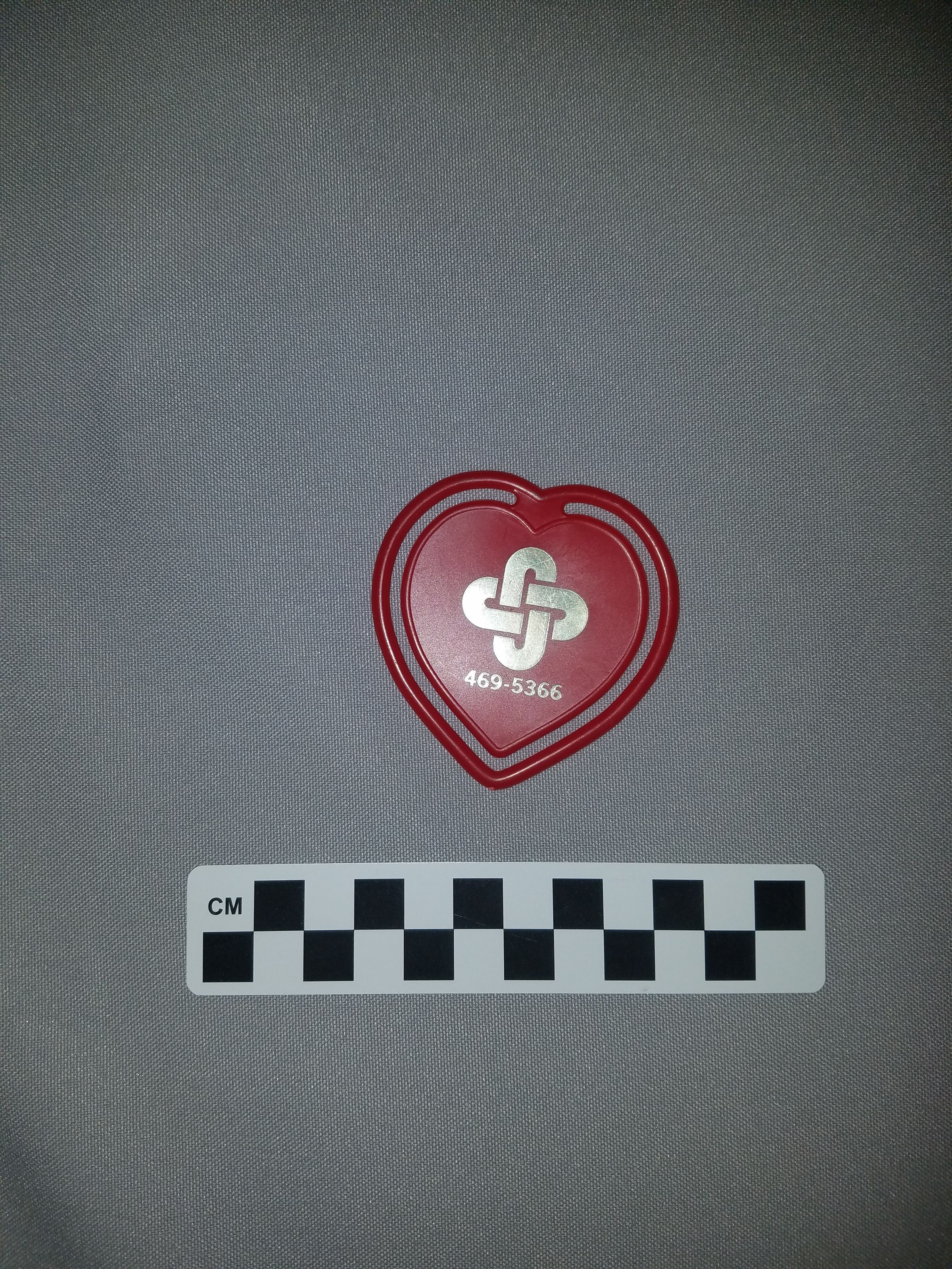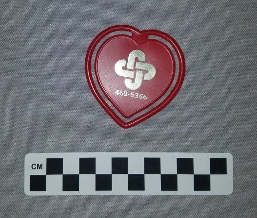 This is a heart-shaped, red plastic paper clip. The clip has the logo for an unknown business (The donor thought it was Rocky Flats Credit Union) printed on the front in gold. Under the logo is the phone number "466-5366". The paper clip measures 2.5" (w) x 2.5" (l).