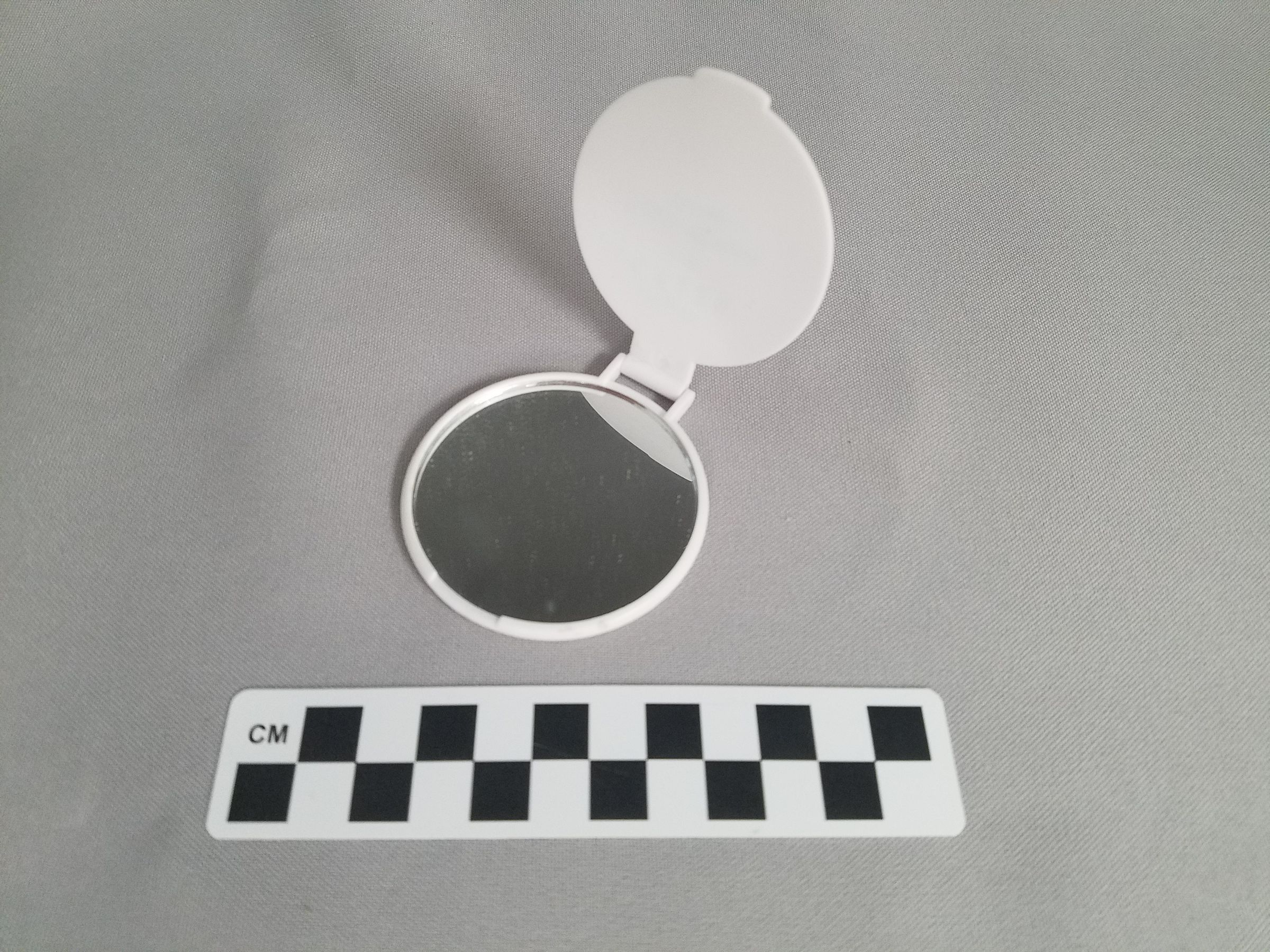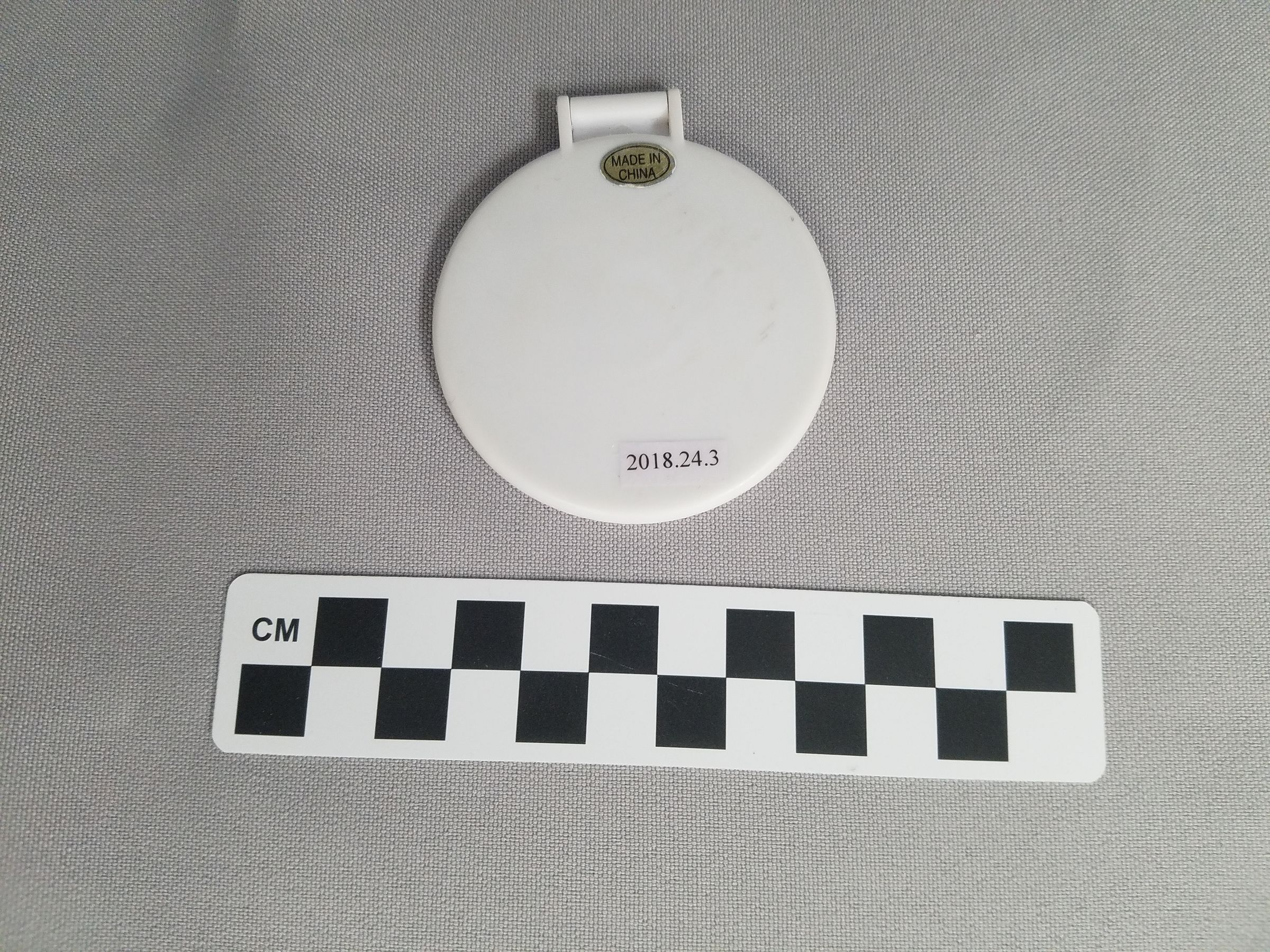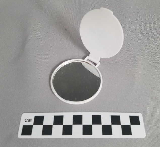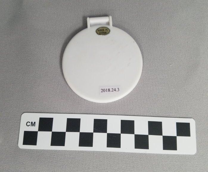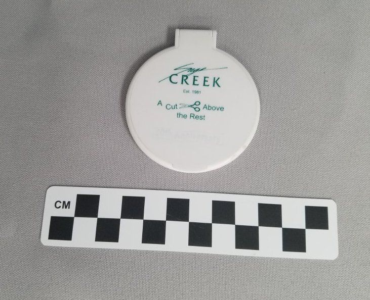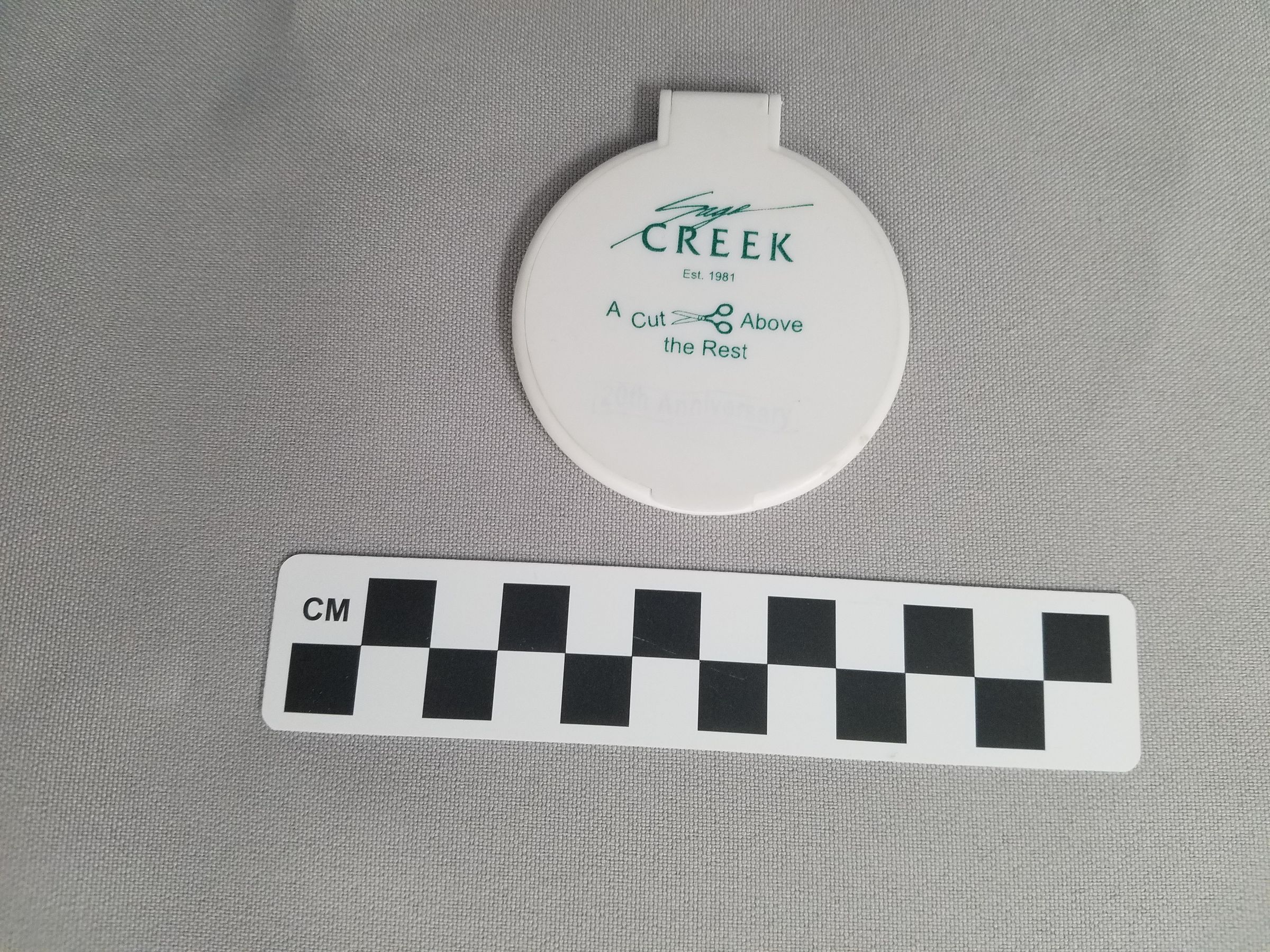 This is a round, white plastic compact mirror. The mirror has green text on the front of it that reads, "Sage/ CREEK/ Est. 1981/ A Cut Above/ the Rest/ 20th Avviversary". There is a hinge at the top of the compact to open the mirror. There is an oval shaped gold sticker on the back with black text that reads, "MADE IN/ CHINA". The mirror measures 2.5" (diam).