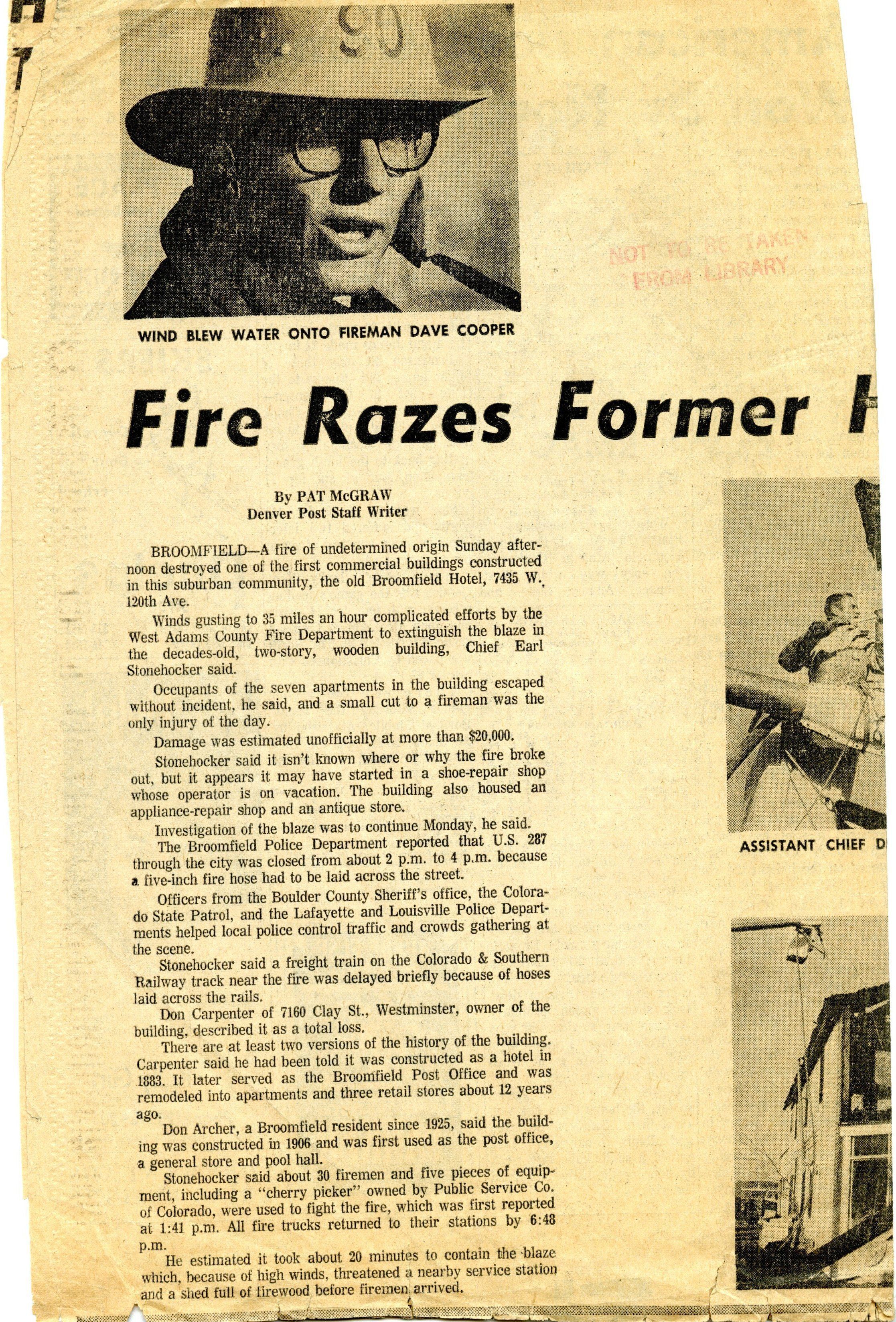 Article about the destruction by fire of the old Broomfield Hotel. Newspaper article cut out from The Denver Post.