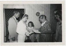 Black and white photograph of three women, one man, and one girl in a small room. The man is Gib Brunner. The woman on the left side of the image, dressed in white, is Ila Brunner. The girl is standing and looking at Gib. The older woman is looking at a book while the third woman looks on.Photograph Details