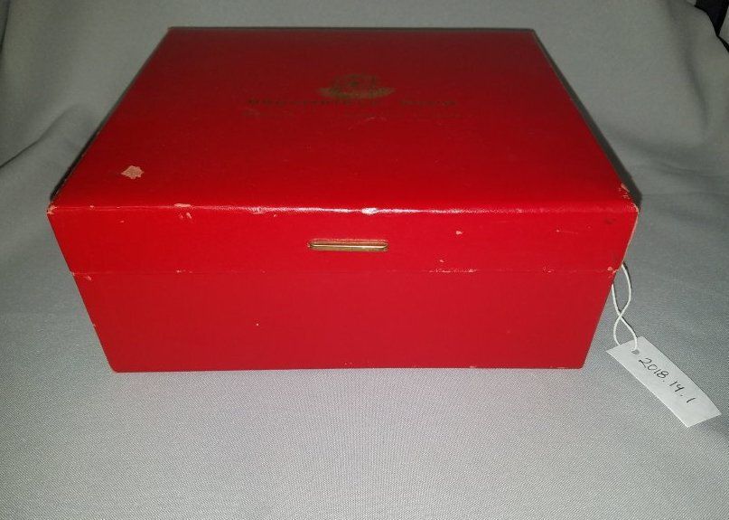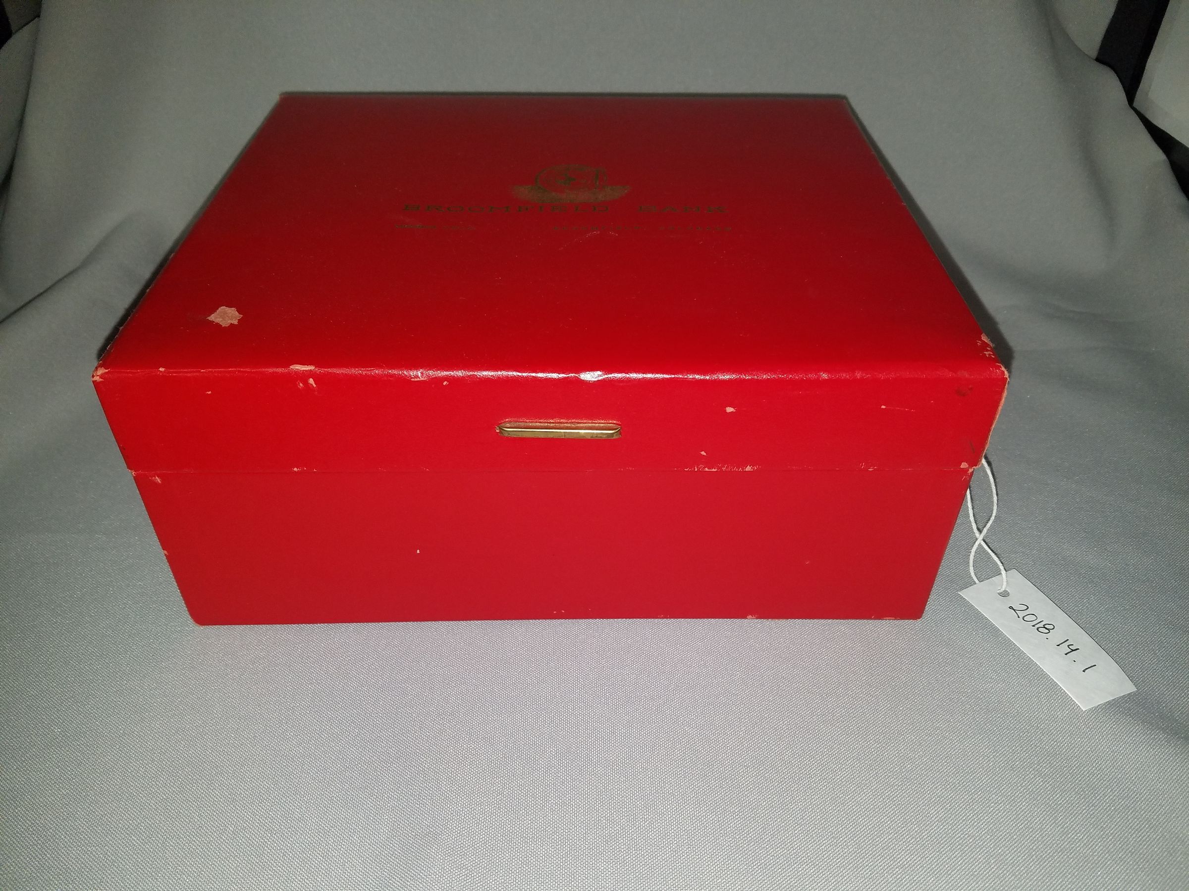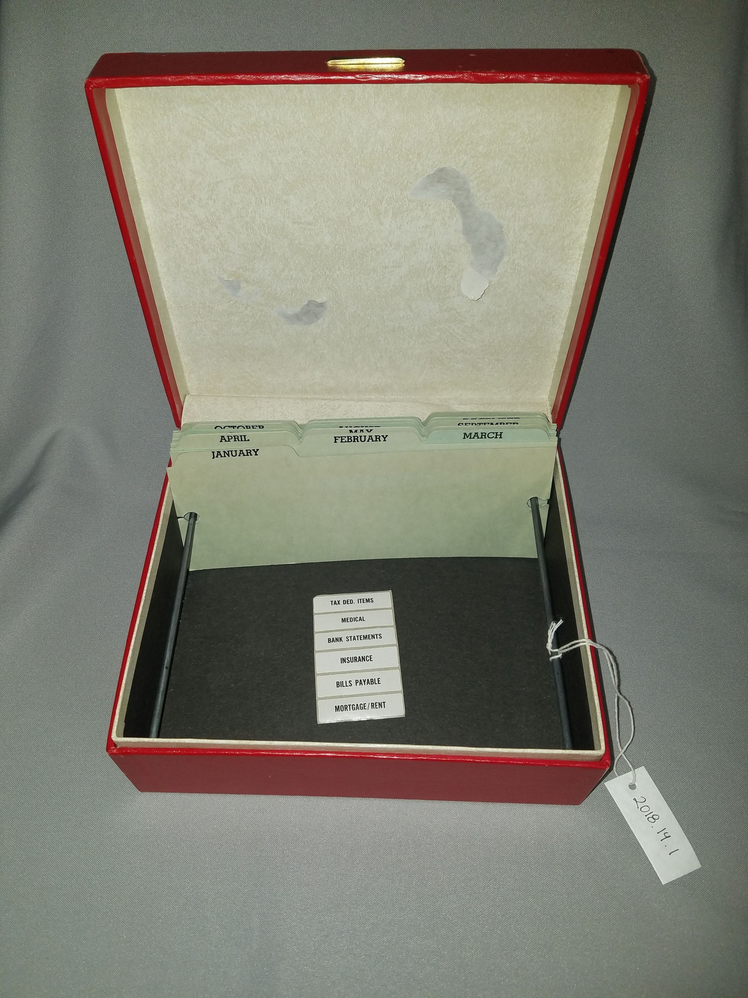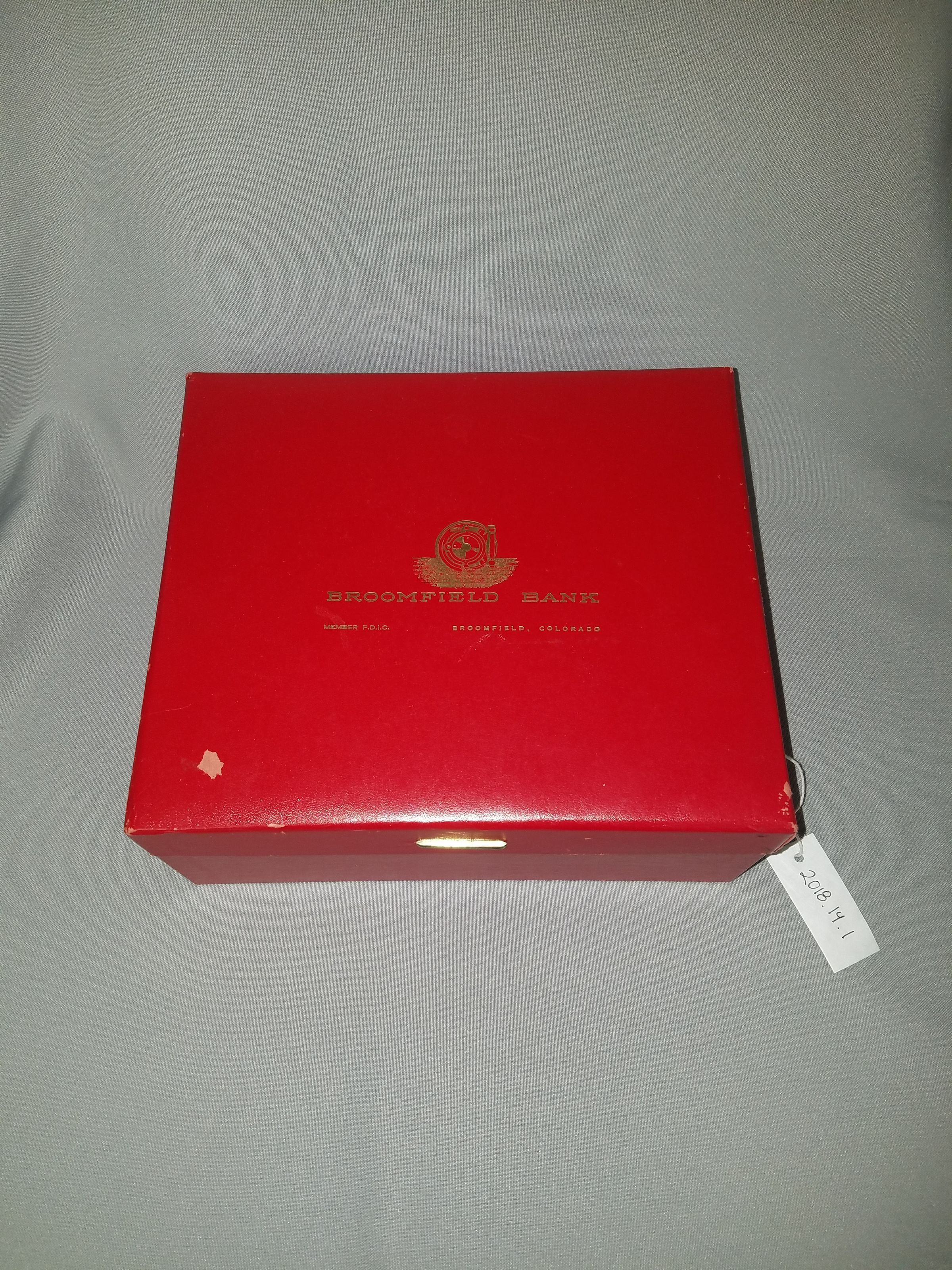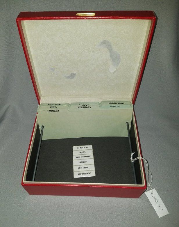 Red, hinged box from the Broomfield Bank. Written on the top of the box in gold lettering is "Broomfield Bank . Member F.D.I.C. Broomfield, Colorado". Inside the box are 15 tabbed separators - 12 of these are labeled with each of the months, the remaining 3 are blank - as well as a small sheet of 6 stickers which read: "Tax Ded. Items", "Medical", "Bank Statements", "Insurance", "Bills Payable", "Mortgage/Rent"Collection