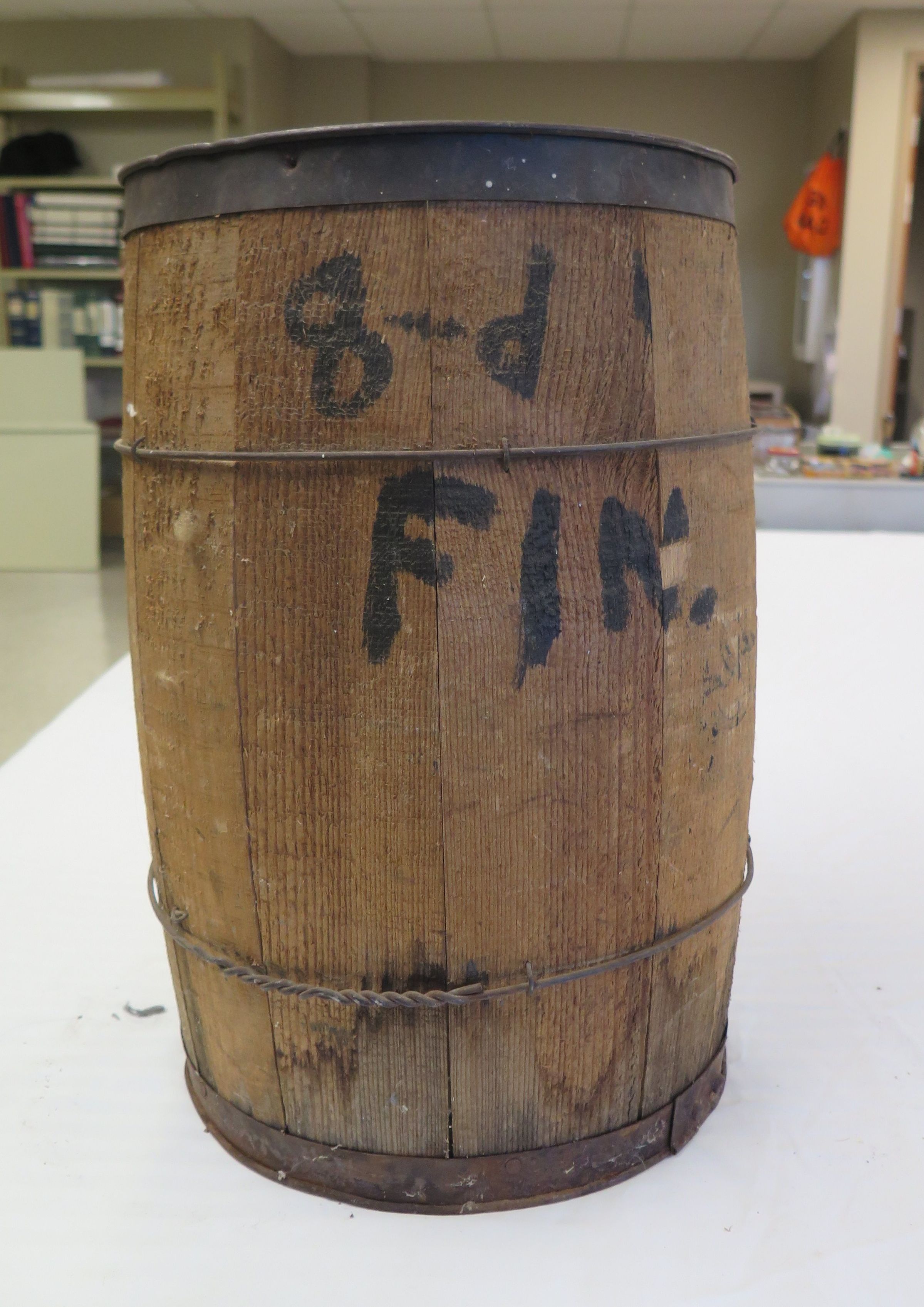 Wooden barrel with metal ties. Some writing in black paint reading "8-d FIN.". Use unknown.Collection