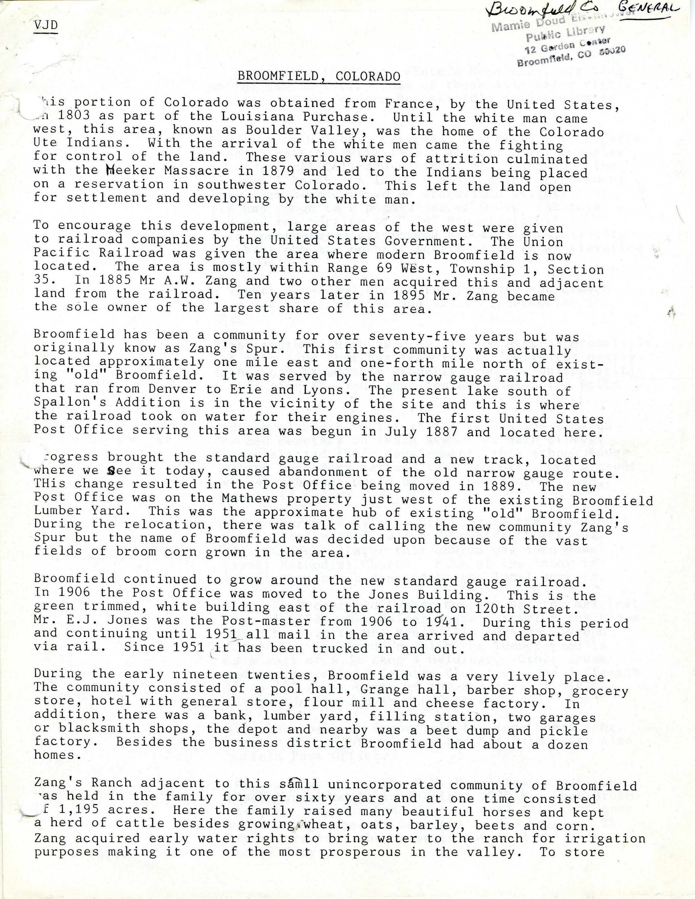 Typed document of Broomfield history. Originally publically available at the Mamie Doud Eisenhower Library when it was at 12 Garden Center, and is stamped as such in top right corner. Estimated publication date is around 1985.