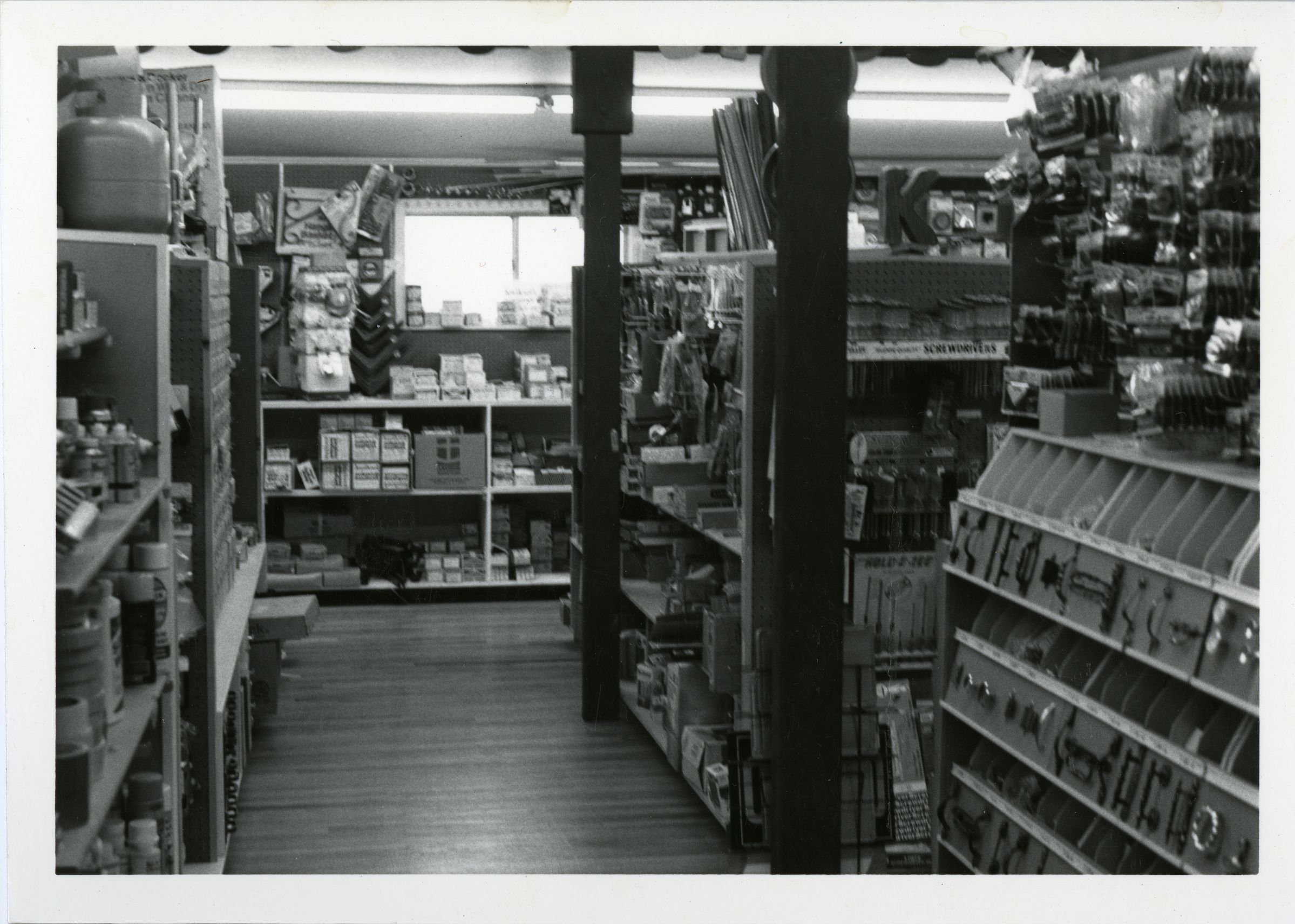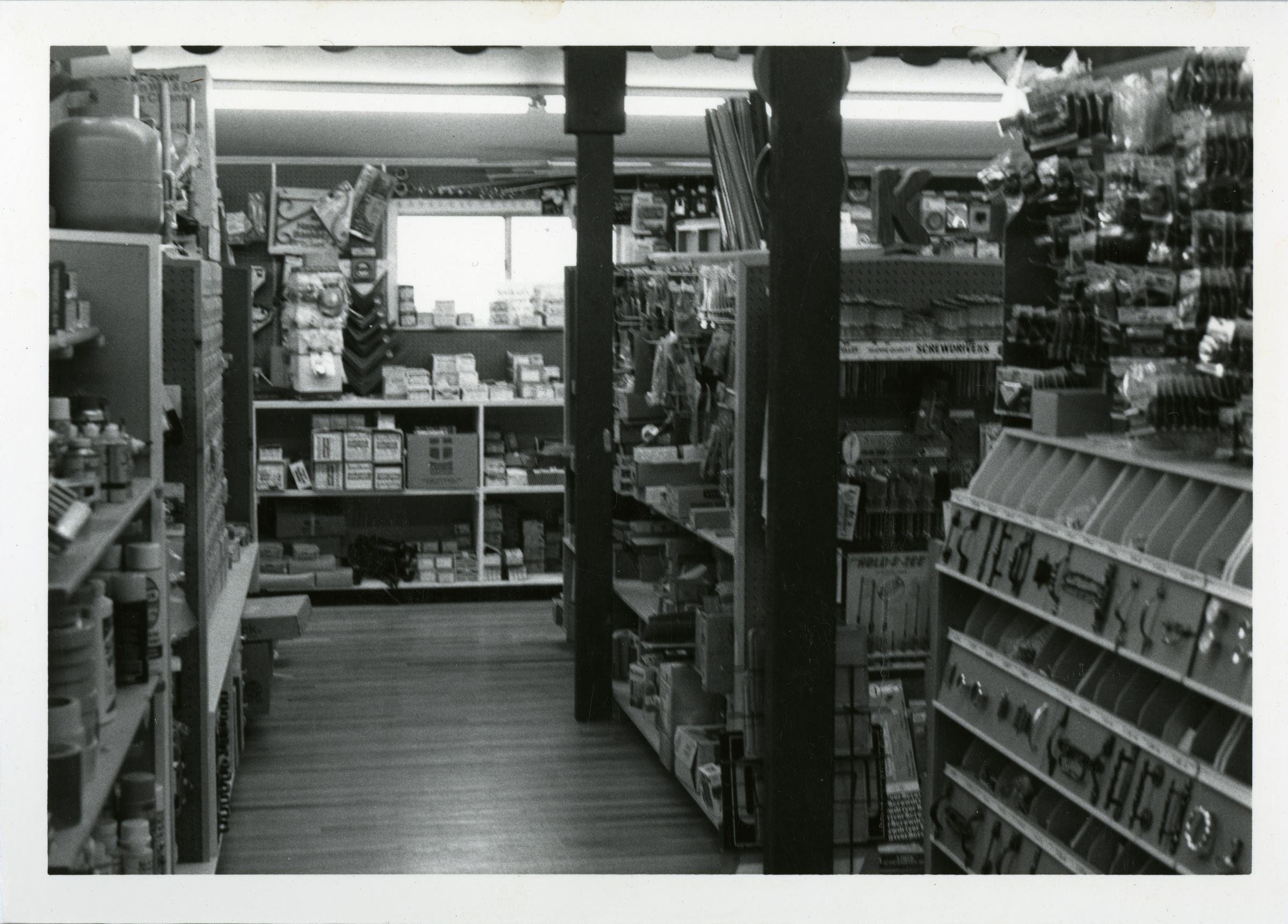 Black and white photograph print of the Broomfield Lumber Company's interior and shelving, 1980. The print is 5" x 7" mounted on a card board. The image shows several stocked shelves in the store, and hardware items such as door knobs and handles, framing, and various boxes. A smooth hardwood floor leads forward near the center of the image, with shelves on either side and straight ahead of the viewer. Two wooden supprt beams can be seen by the shelves on the right side of the image.