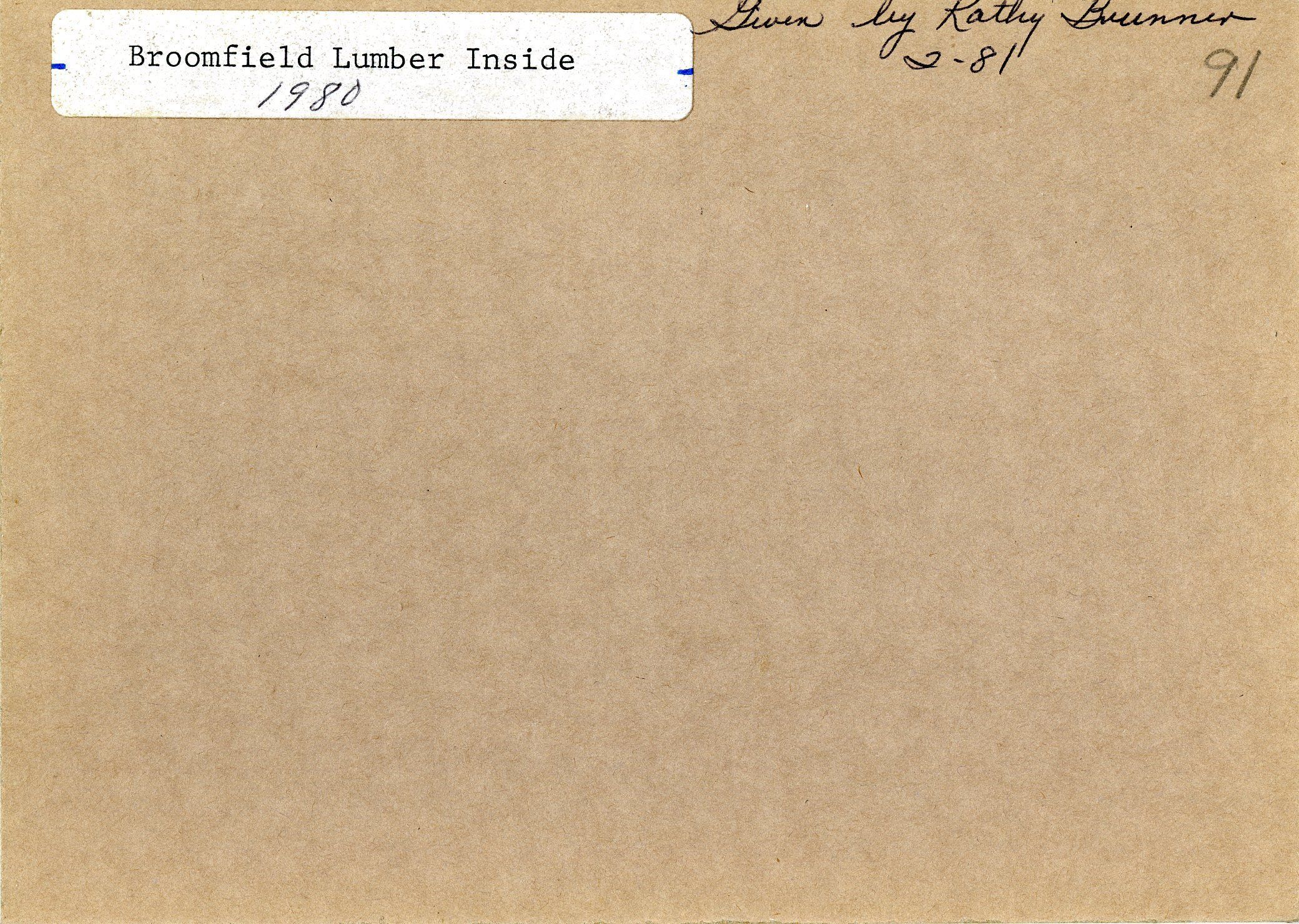 The reverse side of the photograph has a file folder label with the printed text, "Broomfield Lumber Inside," followed by the year "1980" written in black ink.Photograph Details