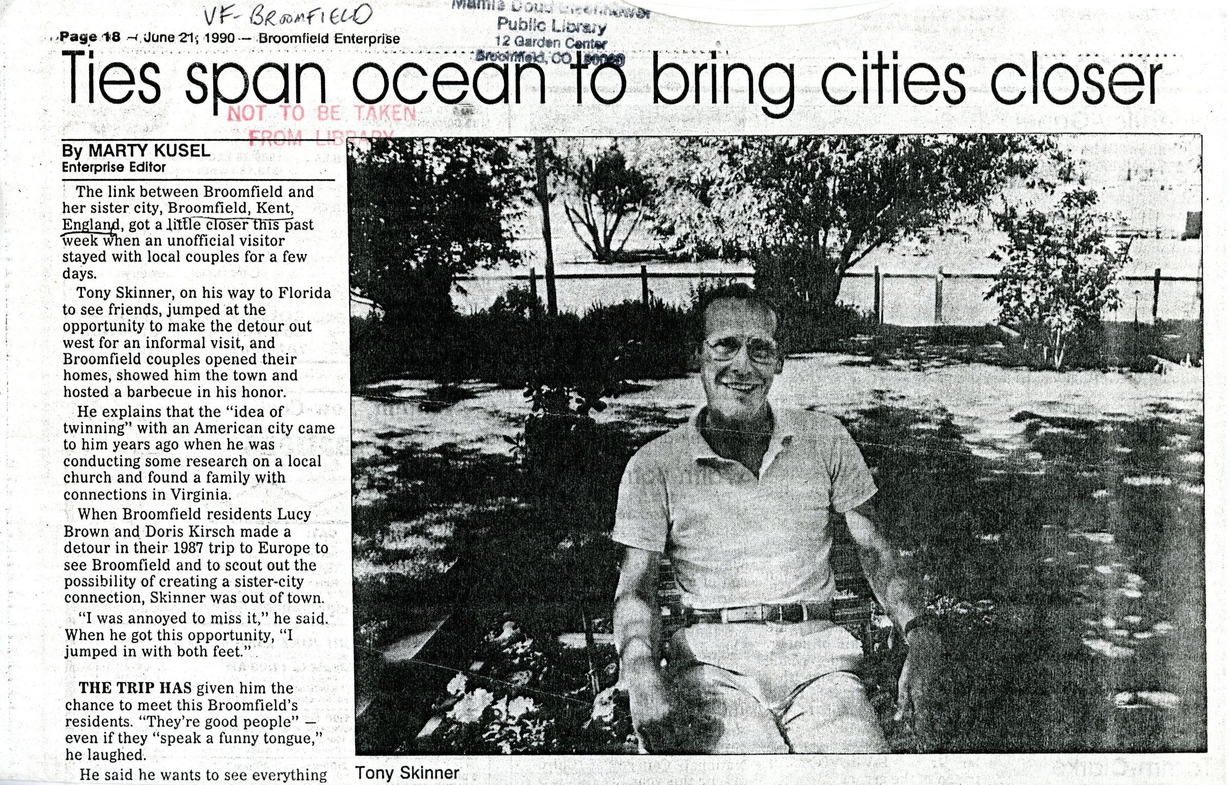 A photocopy of an article cut from the Bromfield Enterprise. Includes additional photocopy. Article is about the link between Broomfield and her sister city Broomfield, Kent, England.Lexicon
