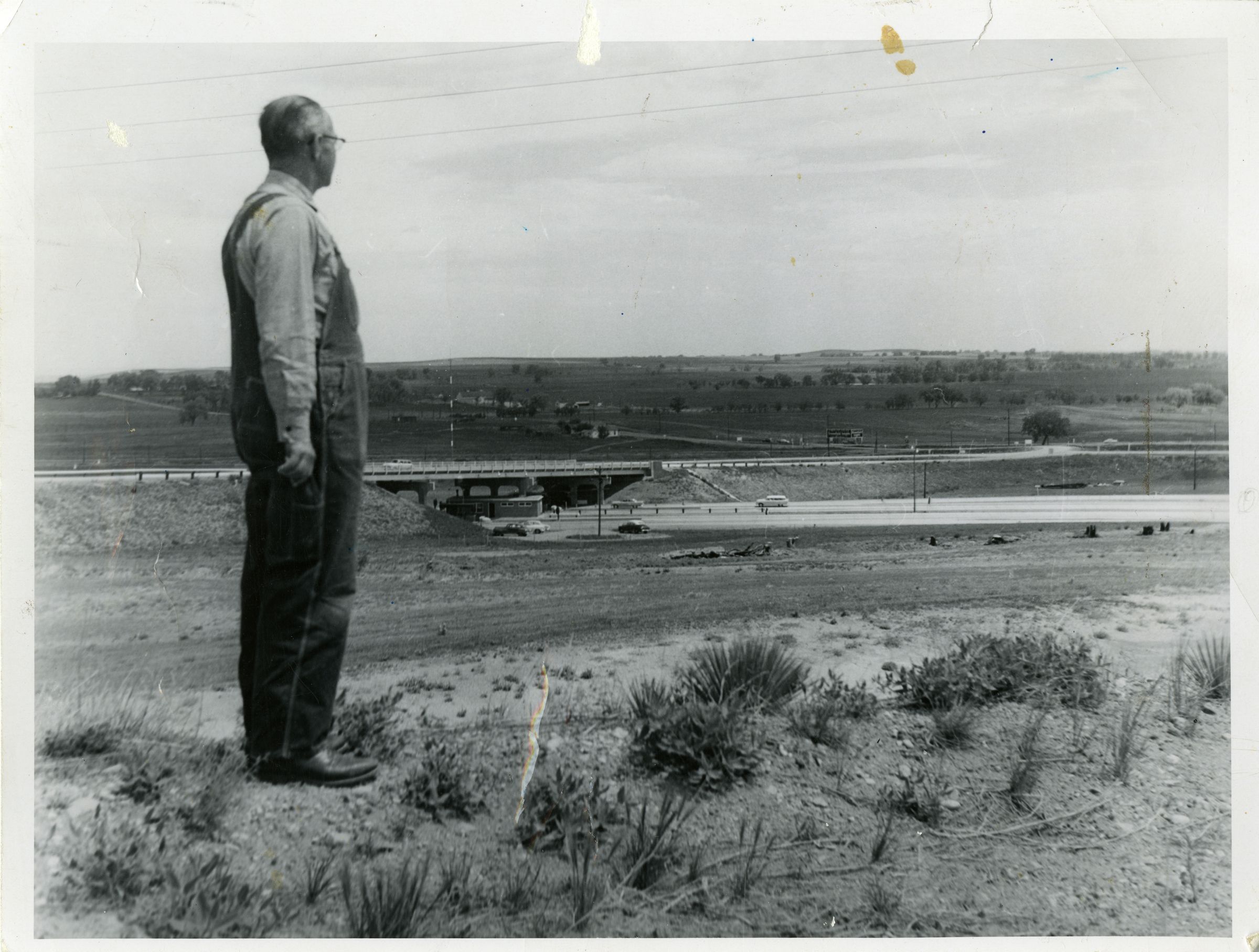 Black and white photograph print of Joseph Huddart standing in an open field overlooking roads and highways passing through Broomfield , circa 1955. The print is 5" x 6.5". The image shows Huddart on the left wearing overalls, a buttoned shirt, and glasses seen in profile as he looks in the distance. The roads and highways shown are likely 120th going under Highway 287, with the Denver-Boulder Turnpike in the distance. Traveling cars and a small structure can be seen under the 287 overpass.Photograph Details