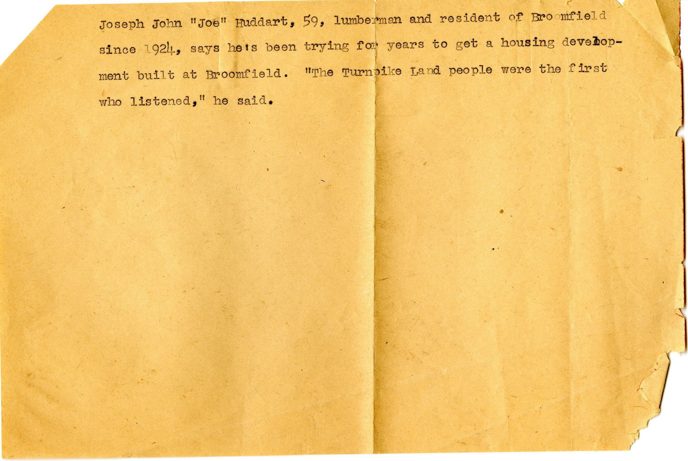 Found in Broomfield Depot Museum collections in "Huddart" photo file. Accession information is unknown as of 12/07/2016. Accompanying document found in photograph's sleeve suggests the photo was taken sometime around 1955, when Joseph Huddart was 59 years old.