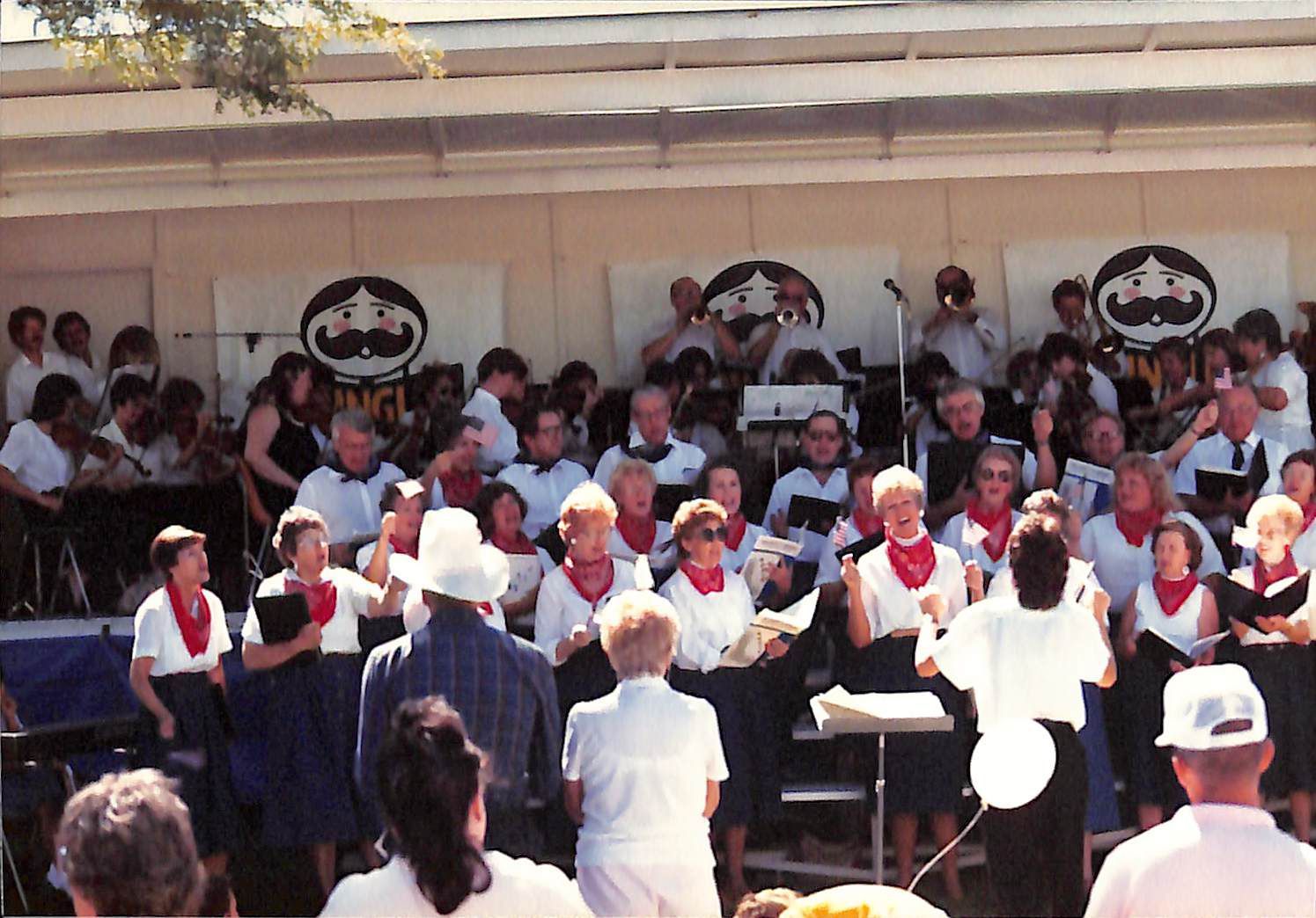 Item is a photograph printed on Kodak paper taken during the 1989 Broomfield Days celebration. In the photo, the Broomfield Chorale, a singing group, performs in the shade beneath the awning of a tan building with Pringles posters on the wall. The members are wearing white shirts and red bandanas around their necks and are singing enthusiastically for the group watching. They are holding song booklets and are being directed by the woman at the front.Photograph Details