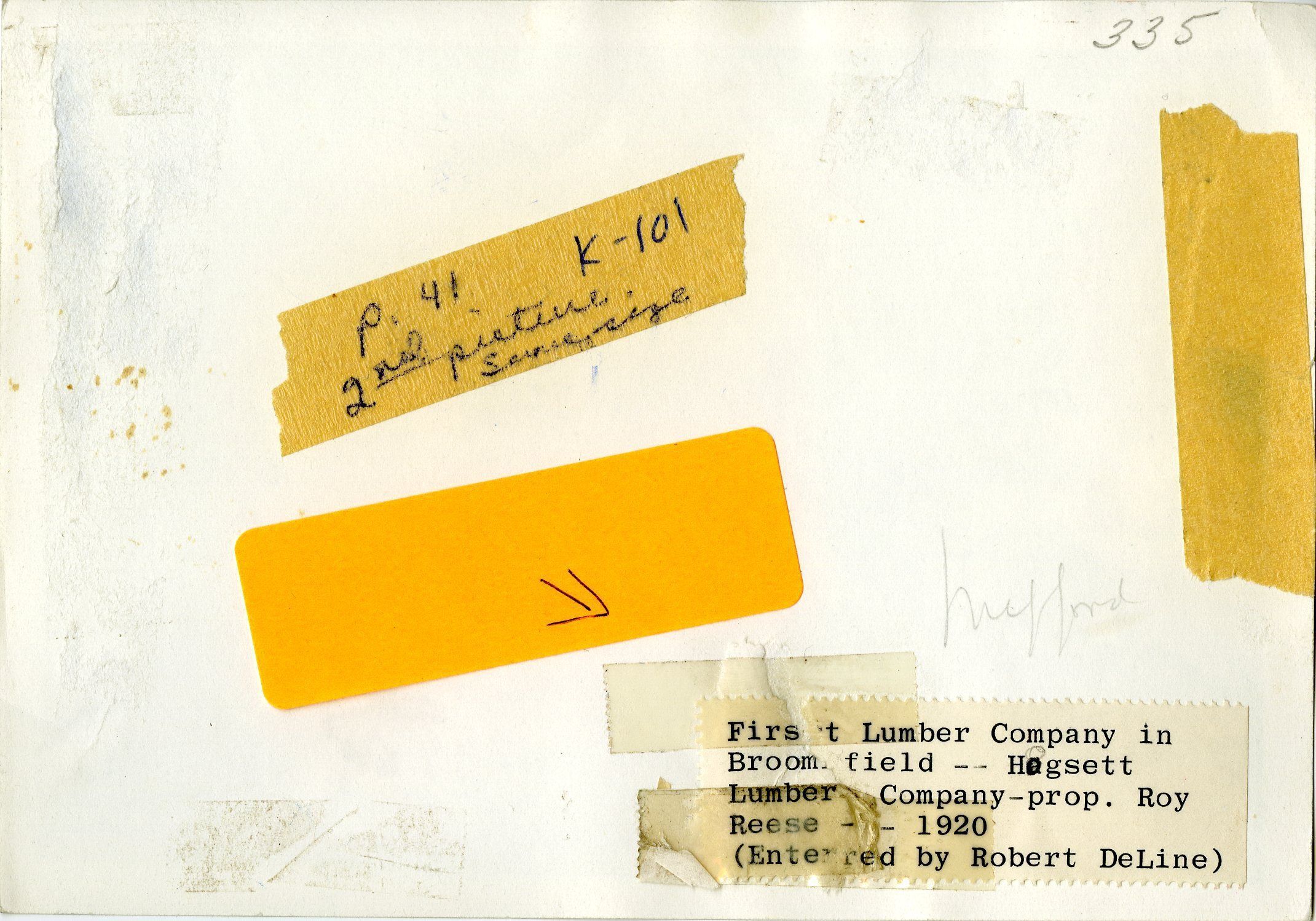 The reverse side has scotch tape with ink inscription directing to page 41 in the book "Gem of the Mountain Valley," where the photograph is displayed. An orange address label has an arrow written on it, pointing to a white address labeled with printed text, stating "First Lumber Company in Broomfield -- Hogsett Lumber Company - Prop. Roy Reese - 1920 (Entered by Robert DeLine)."Photograph Details
