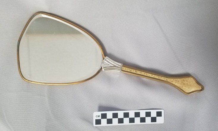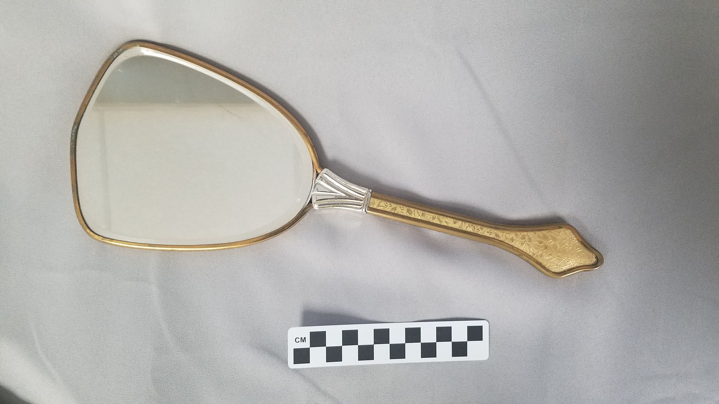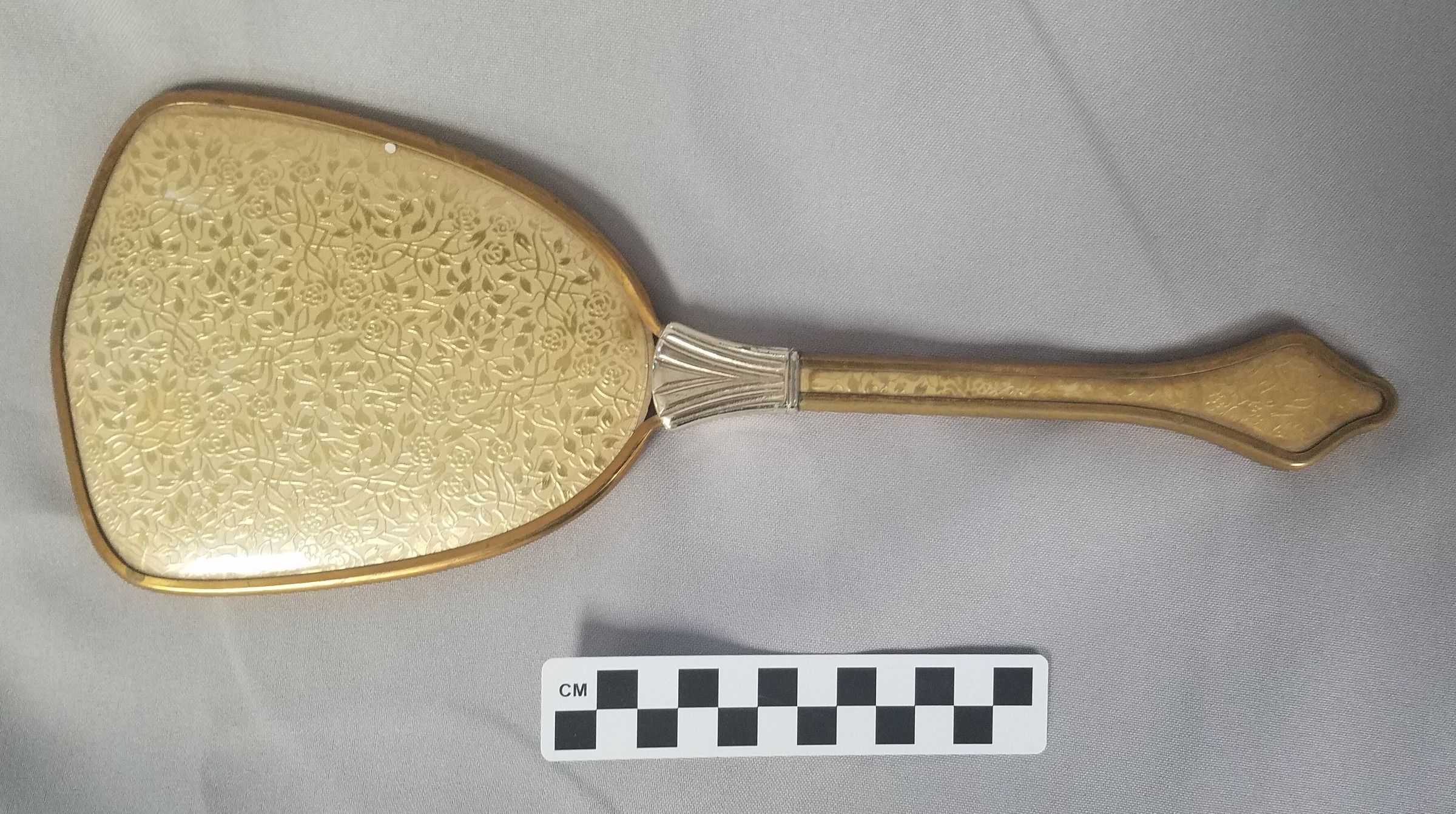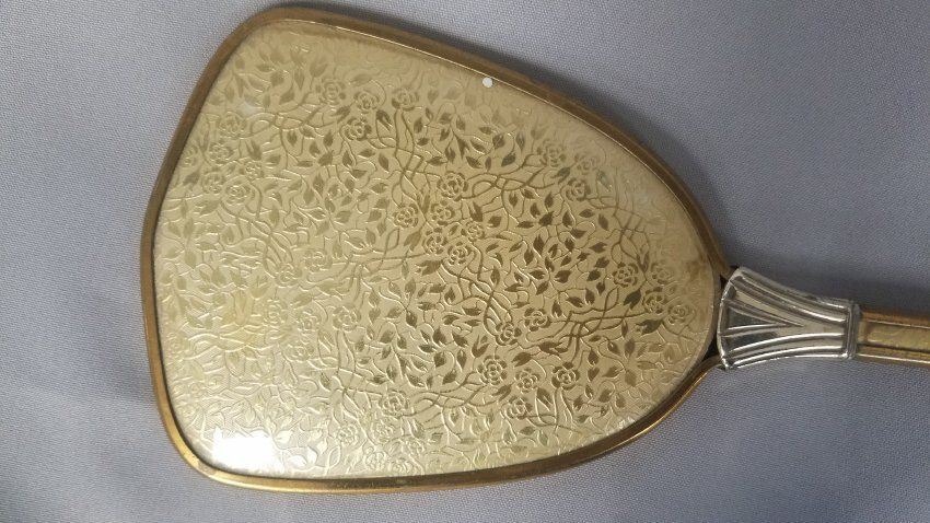 Gold hand mirror with silver colored ferrule. Flower/vine design on the back of the mirror and on the front and back of the handle.