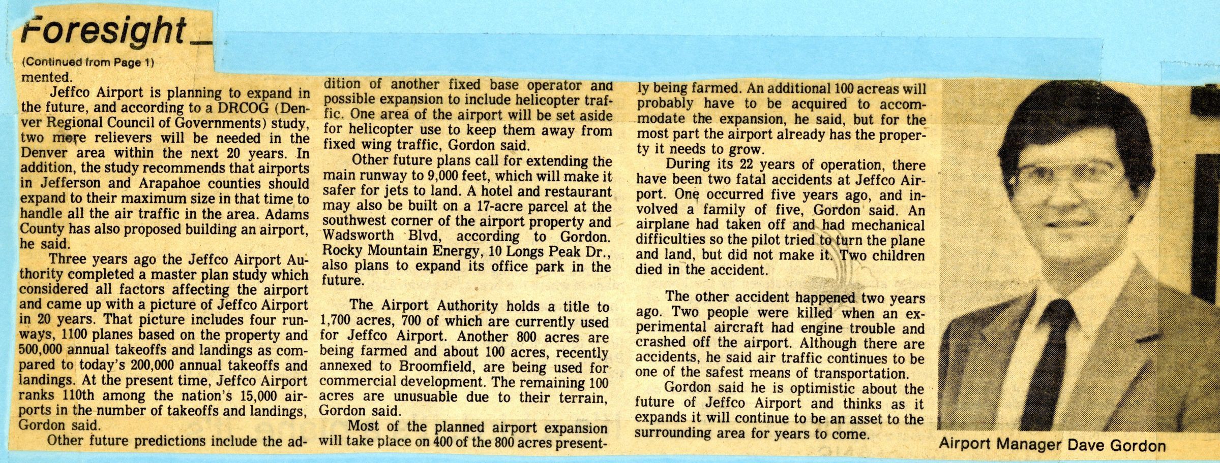 A photocopy of an article cut out from the Broomfield Enterprise and pasted/taped onto cardstock. Includes additional photocopy. Article is about the history of the Jeffco Airport in Broomfield.