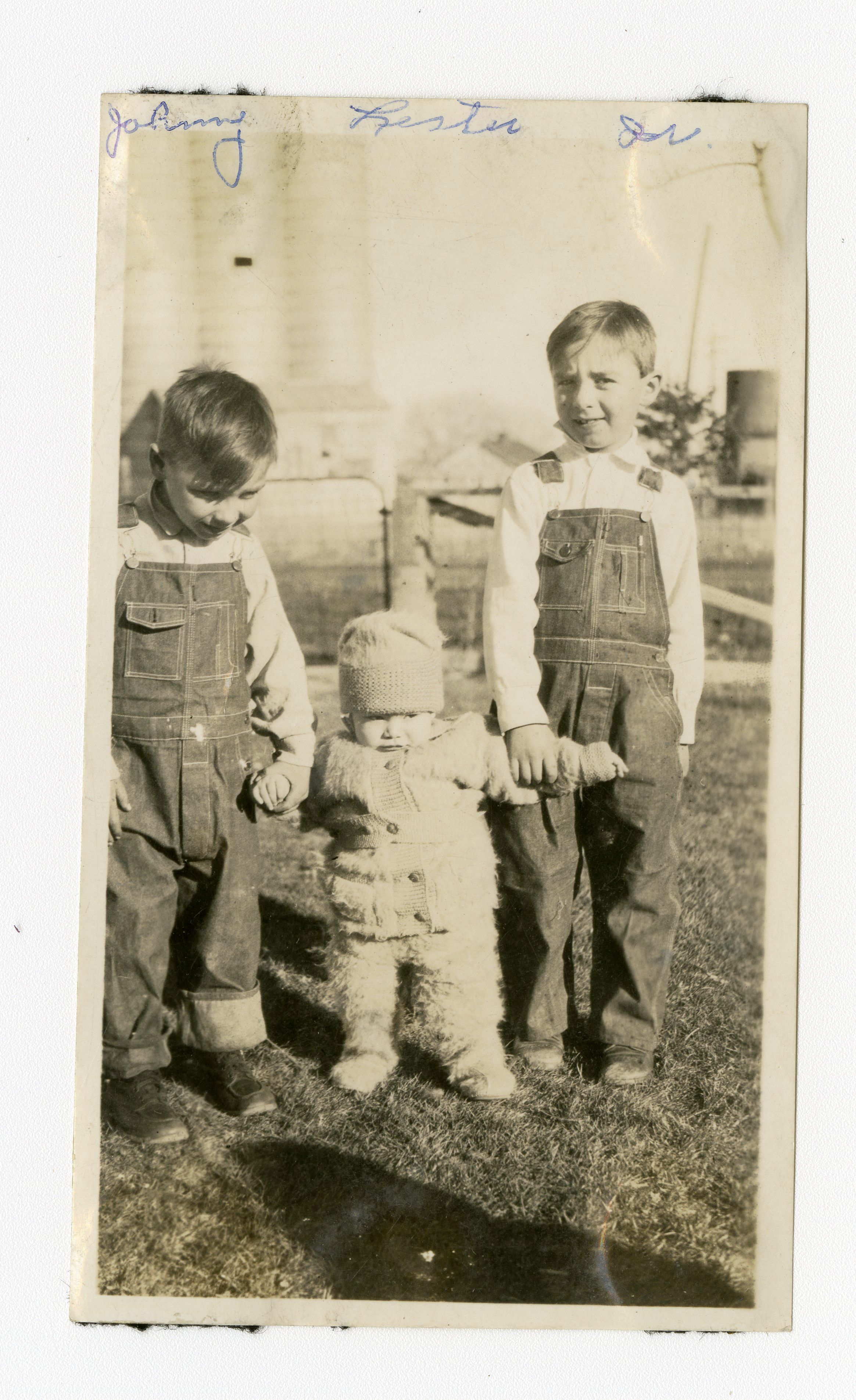 Black and white photograph of three boys. The boy on the left is wearing overalls and a collared shirt. The boy on the right is wearing a collared shirt and overalls. The boy in the middle is wearing a hat and sweater. The three boys are identified from left to right as Johnny, Lester C, and Klein?. The photograph was taken when the Brunners lived in Kansas.