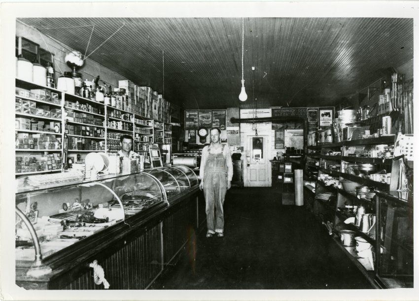 Black and white photograph print of the interior of Broomfield Lumber Company, 1925. The print is 5" x 7". Store owner Joseph Huddart is shown standing in the center of the image, looking at the camera, with a hanging light bulb over his head in the foreground. An employee stands behind a counter with glass cases full of tools and other merchandise on the left. Shelves full of jars and boxes of products are lined up behind the counter. Shelves of other tools, pots, and containers are visible on the right side of the image. The back wall behind Huddart shows a door and a pipe coming out of the wall, connected to a heating stove. Several posters advertising McCormick-Deering farming equipment are visibly posted on the wall.