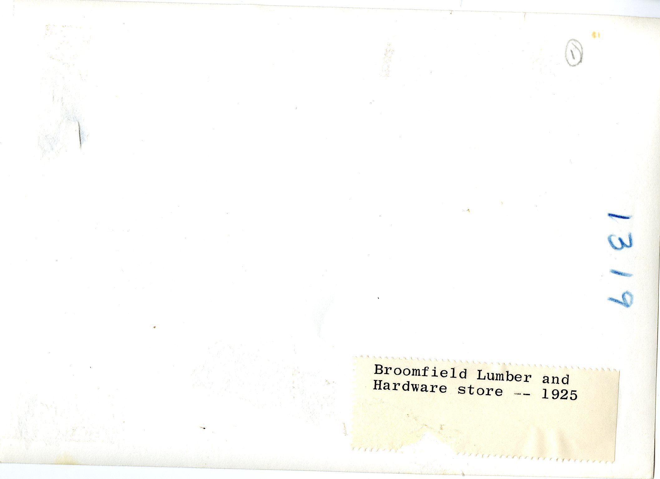 The reverse side has an address label with the text "Broomfield Lumber and Hardware Store - 1925" printed on it, in the lower right corner.Photograph Details