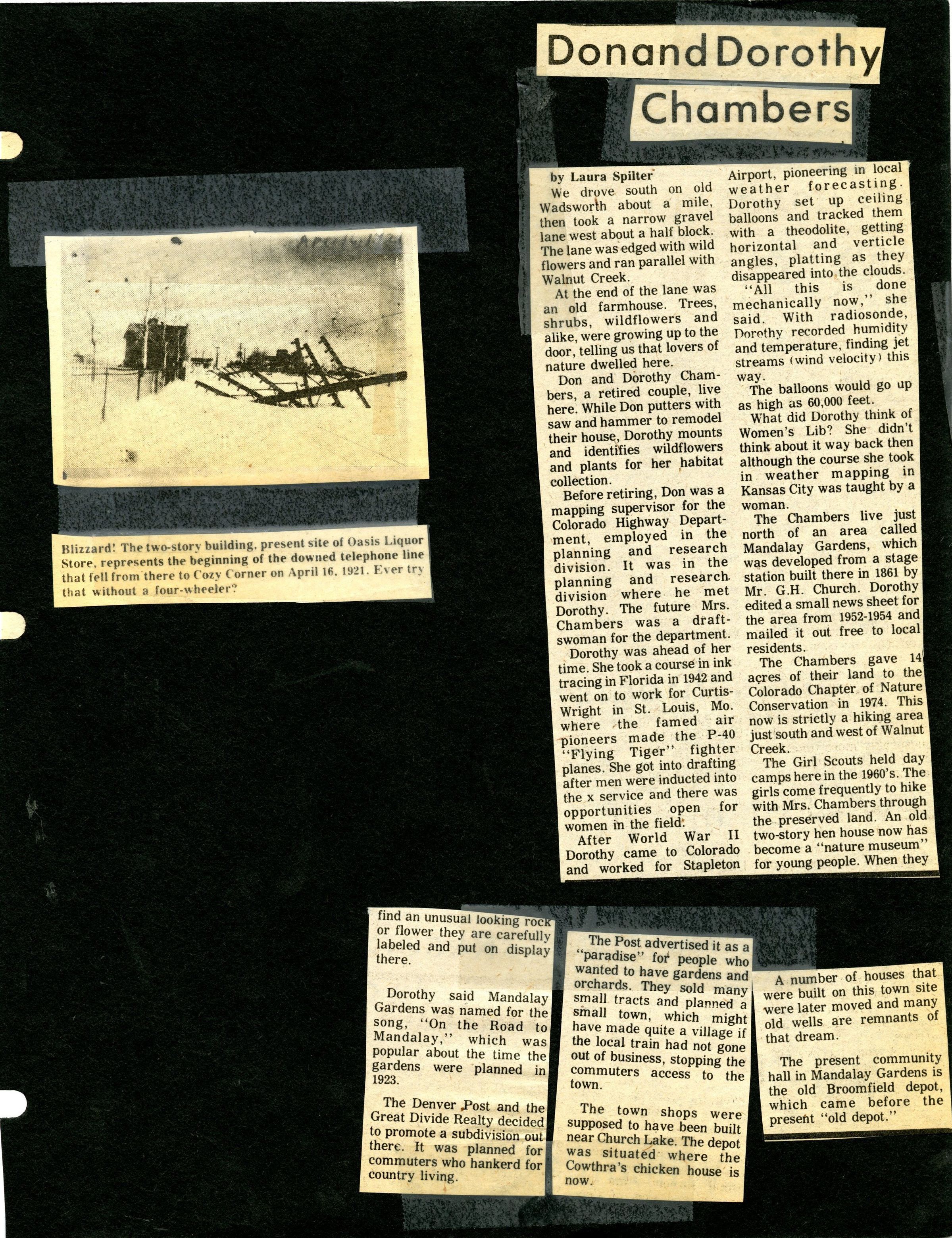 Contains two newspaper articles pasted/taped to front and back of black construction paper. Articles are about Broomfield history. Follows life of Don and Dorothy chambers.