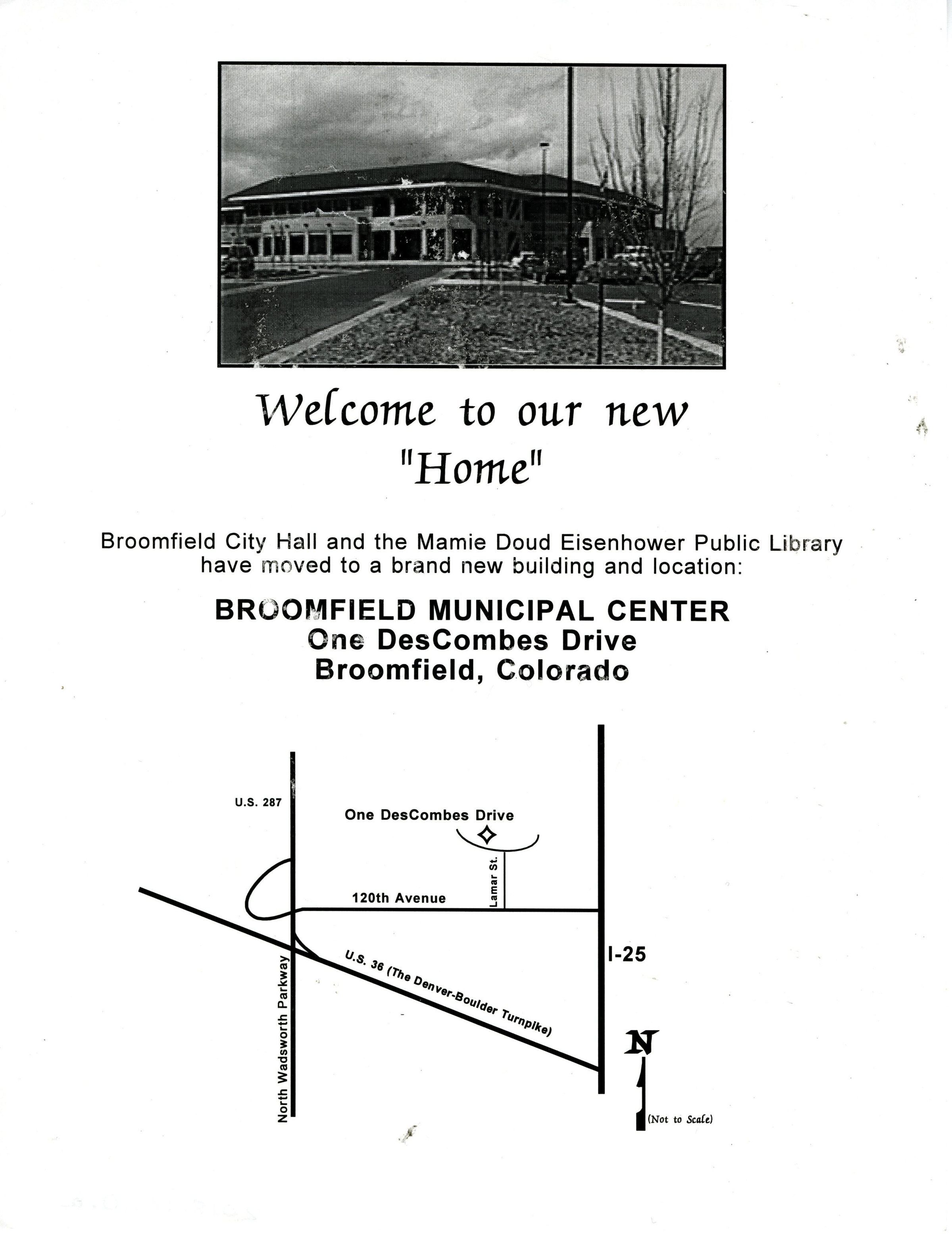 Flyer advertisement for new Broomfield City Hall and the Mamie Doud Eisenhower Public Library. At the bottom of welcome sigh there is a small map
