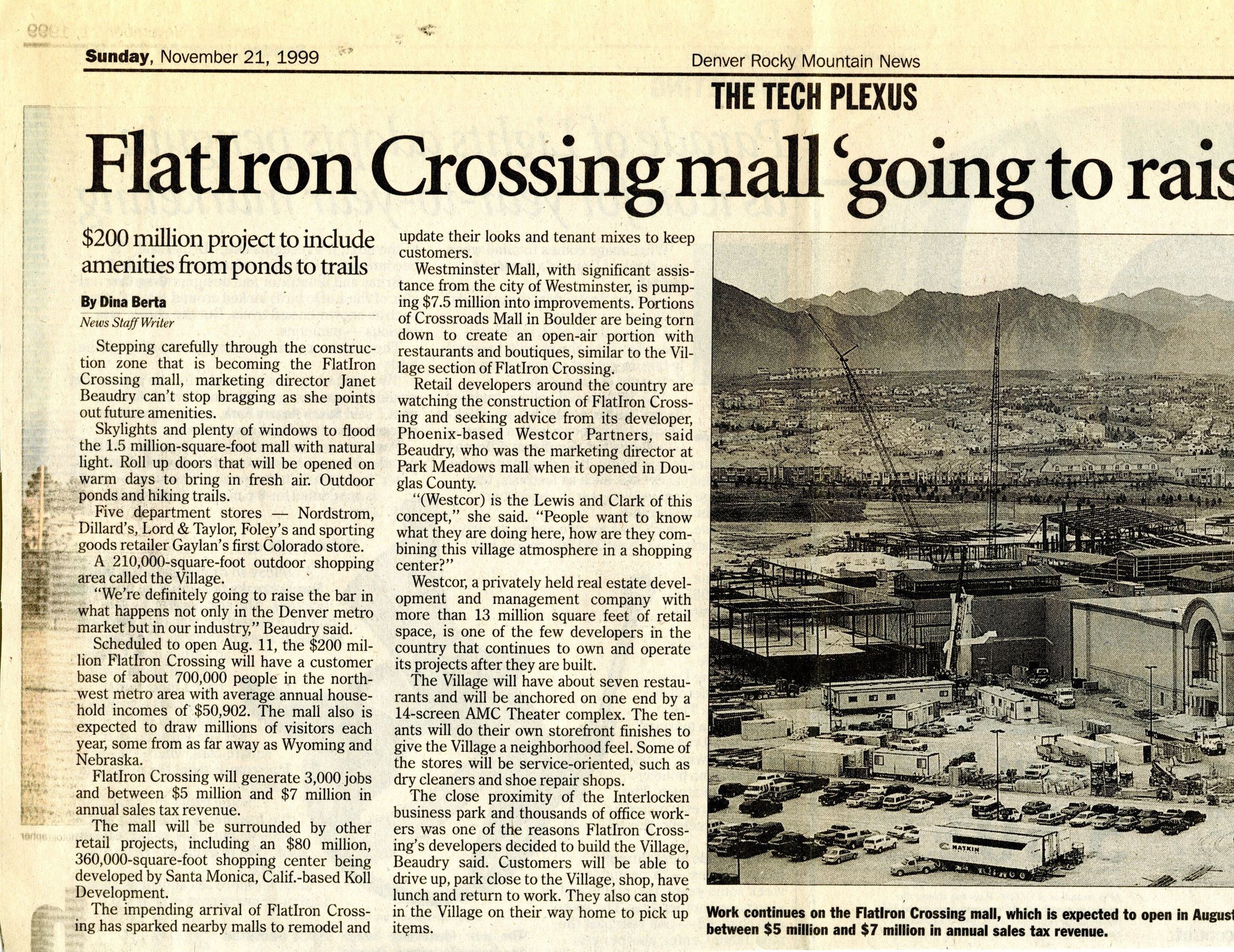 Article cut out from the Denver Rocky Mountain News. Article is about the construction of Broomfield's Flatiron Mall. Some information includes the number of jobs and revenue expected. Artilce published on november 21, 1999