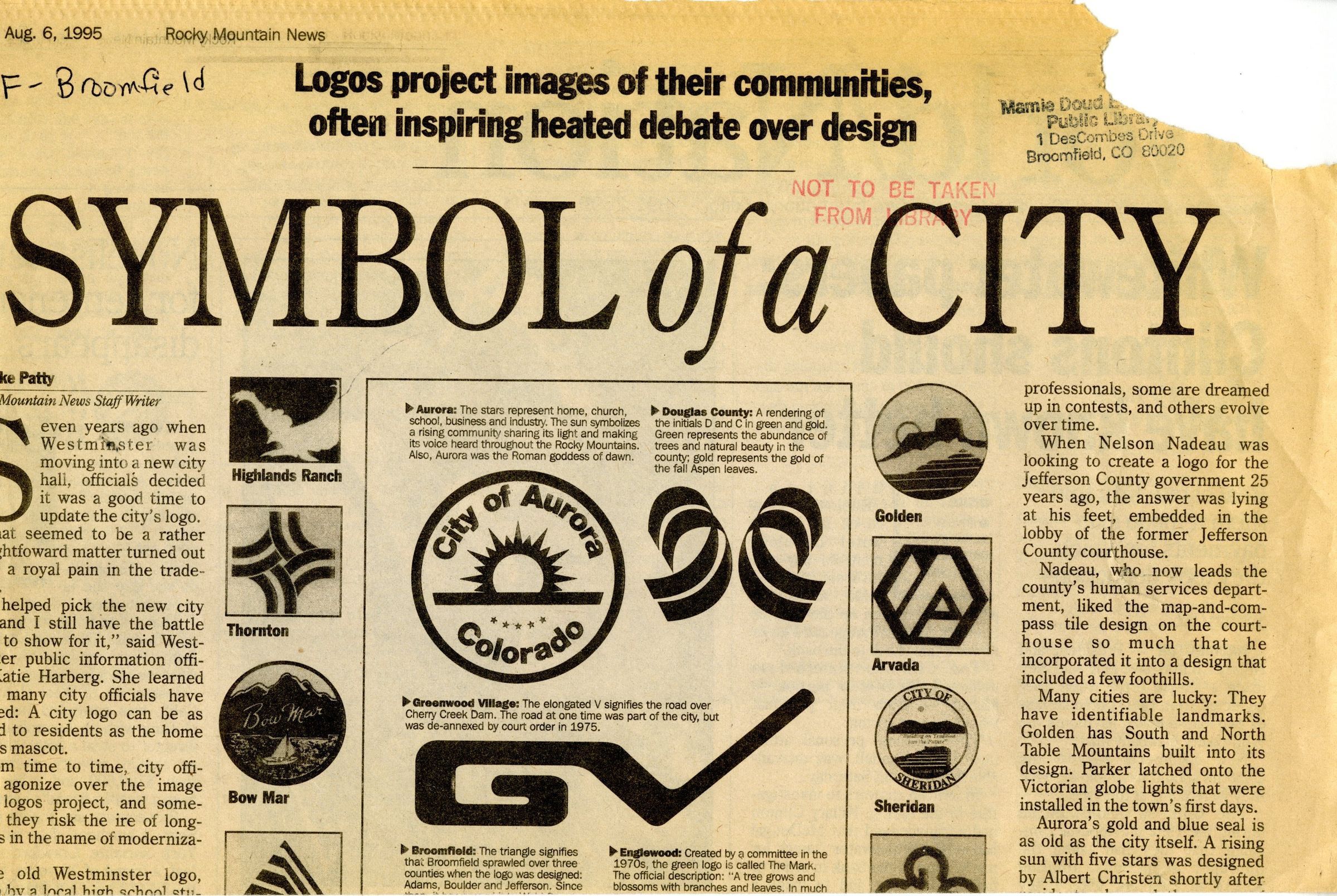 Article cut out from the Denver Rocky Mountain News. Article shows various city symbols including Broomfield. Gets into some history of the brromfield system, and the process Artilce was published on August 6, 1995