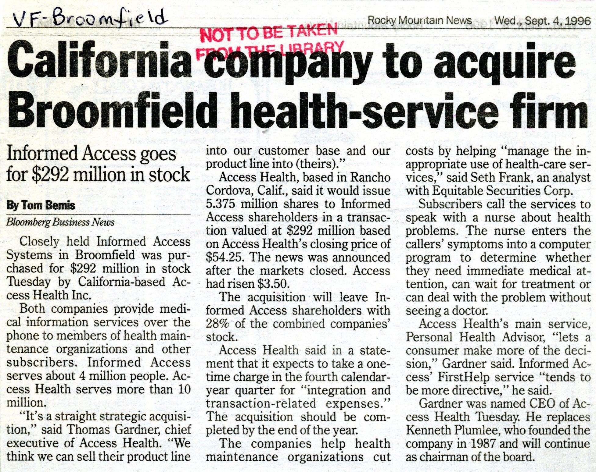 Article cut out from the Rocky Mountain News. Article is about the purchase of the company, "Informed Access Systems" in Broomfield. The article was published on September 4,1996