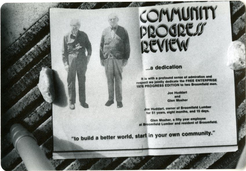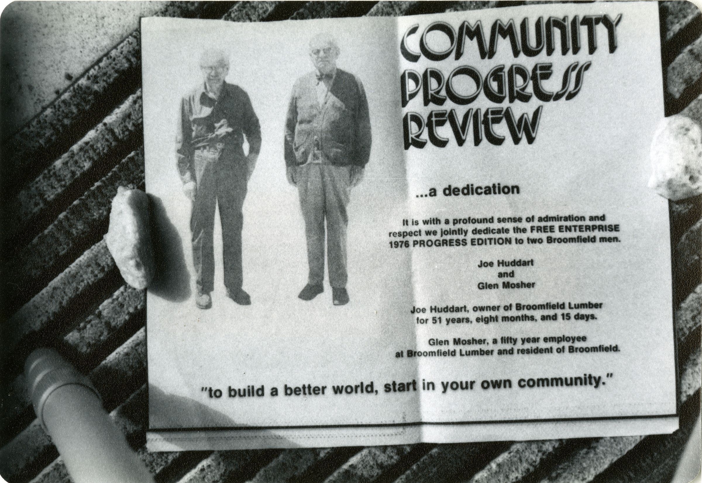 Black and white photograph print of a Free Enterprise newspaper clipping dedicating the paper's Progress Edition to Joseph Huddart and Glen Mosher, 1976. The print is 3.5" x 5", resin coated, with rounded corners. The dedication is part of a paper section called "Community Progress Review", and gives honors to Huddart and Mosher for their contribution toward developing the Broomfield community with their long-running lumber business at the Broomfield Lumber Company. The business operated from 1924 to 1976, with Huddart as owner and Mosher his longtime, trusted employee. Pictures of the two men are printed on the left side of the clipping, Mosher on left and Huddart on right.