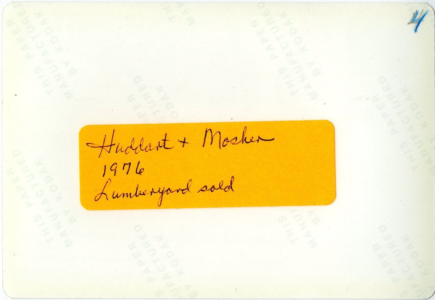 The reverse side has an orange address label with handwritten inscription, in ink: "Huddart & Mosher 1976 Lumberyard sold."Collection