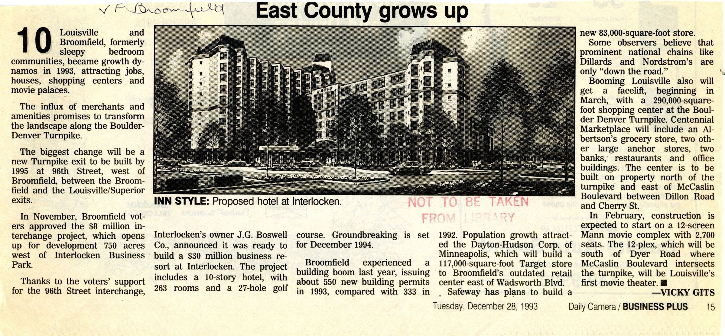 Article cut out from the Daily Camera. Article is about the Broomfield Interlocken Business Park and new development. The article was created on December 28,1993 Talks about a possible hotel being built