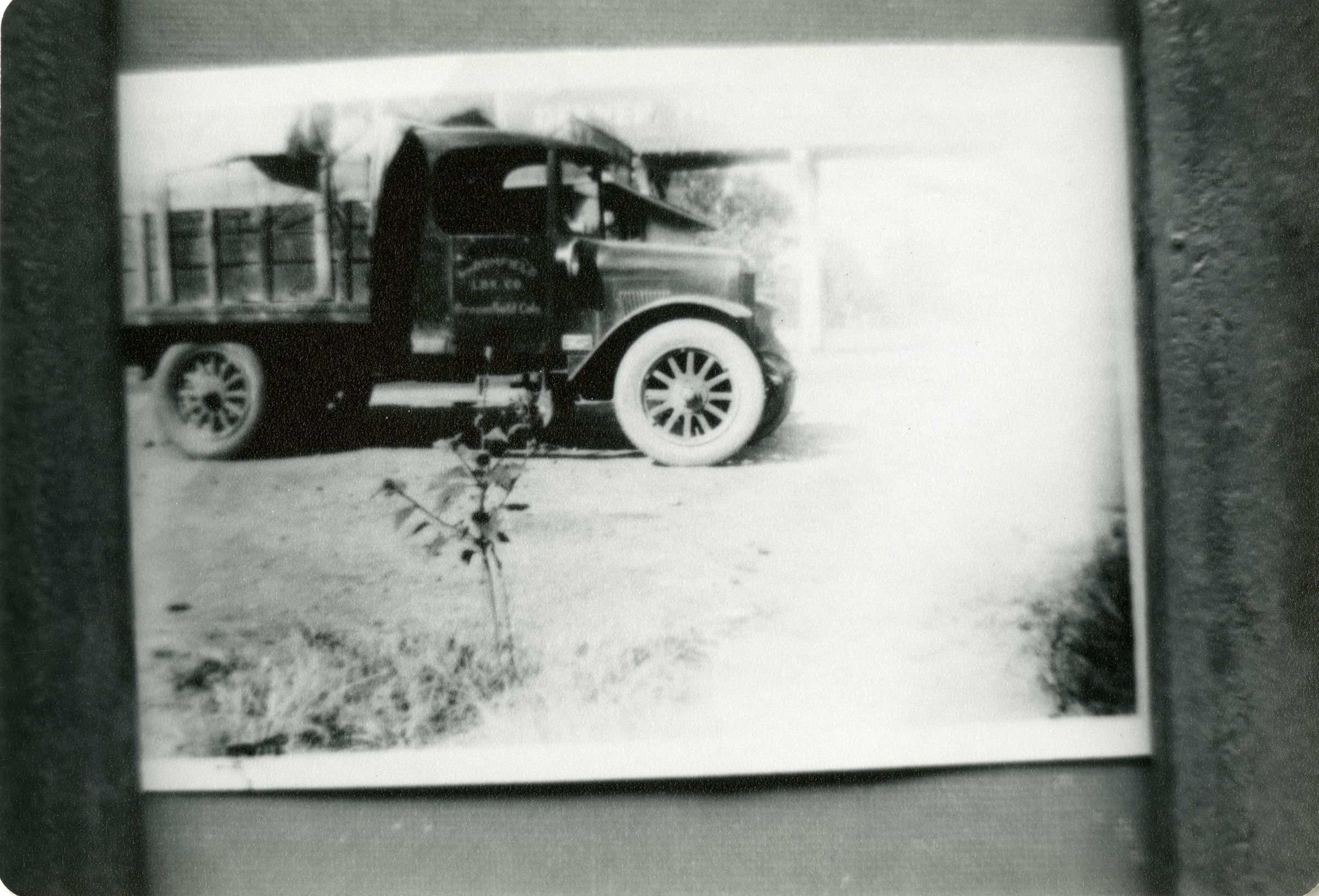 Black and white photograph print of another photograph of a Broomfield Lumber Company truck, circa 1930. The print is 3.5" x 5", resin coated, with rounded corners. The original photograph in the image appears to be a silver gelatin print. The left side of the image shows the 1920s era truck from the side, with the company's name, "Broomfield Lbr. Co., Broomfield, Colo." clearly painted on the door. The truck has a large, wooden flatbed filled with materials, covered with a tarp. A small plant is visible just in front of the truck in the foreground. The right side of the image is overdeveloped, with a large white blur obscuring the image.Collection