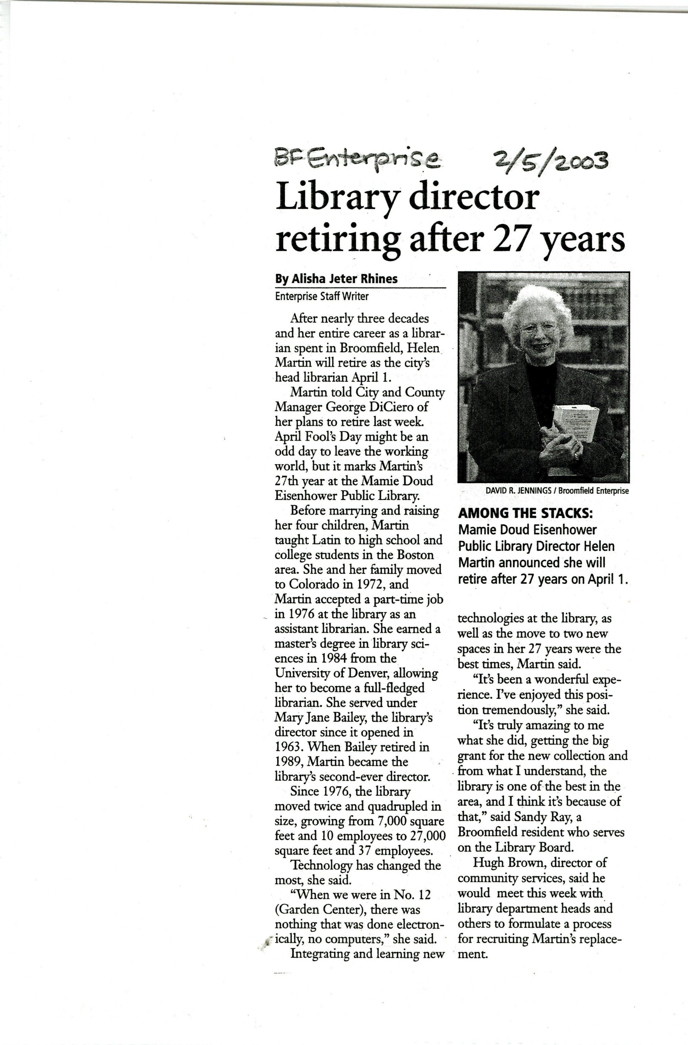 Photocopy of a newspaper clipping cut out from Broomfield Enterprise. Helen Martin, Library Director, retiring Author is Alisha Jeter Rhines