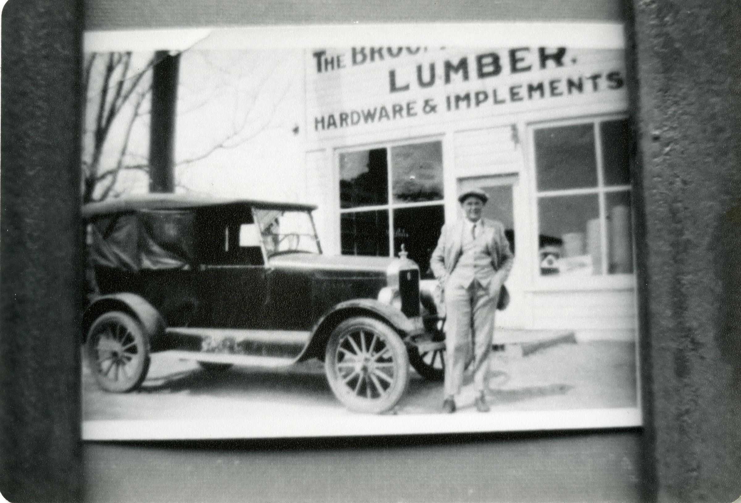 Black and white photograph print of another photograph of a man standing by a car near Broomfield Lumber Company, circa 1930. The print is 3.5" x 5", resin coated with rounded corners. The original photograph in the image appears to be a silver gelatin print. The image shows a 1920s era automobile from the side, with a man standing in front of the hood with his hands in his pocket, possibly Broomfield Lumber owner Joseph Huddart. The man is wearing suit jacket and vest with slacks, and a newsboy cap. A telephone pole and tree are visible to the left behind the car. The storefront for Broomfield Lumber Company is in the immediate background, showing the front door and shop windows with various items stacked and displayed. The store sign is visible above the door and windows, cut off along the top edge of the image. The sign reads, "The Broomfield Lbr. Co. Lumber, Hardwares & Implements."Collection