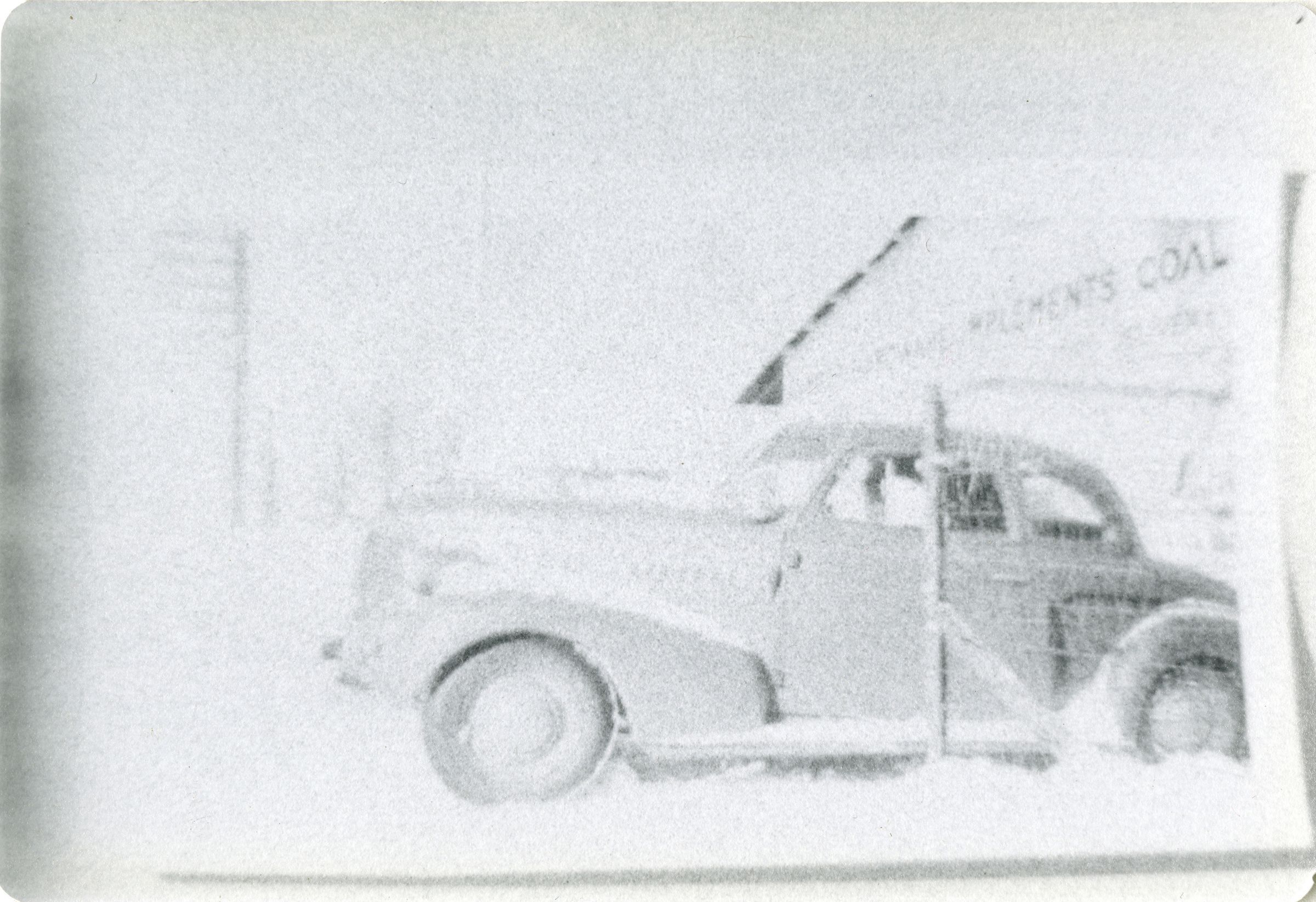 Black and white photograph print of another photograph depicting a car parked by the Broomfield Lumber Company, circa 1940. The print is 3.5" x 5", resin coated, with rounded corners. The original photograph appears to have been a silver gelatin print. The image shows a 1940s era automobile from the side parked by a wire fence, with a Broomfield Lumber warehouse in the background behind it. The warehouse has an obscured sign near the roof, stating "Lumber Hardware Implements Coal," various items the Company sold and supplied within Broomfield. A telephone pole is faintly visible in the background on the left side of the image.Collection