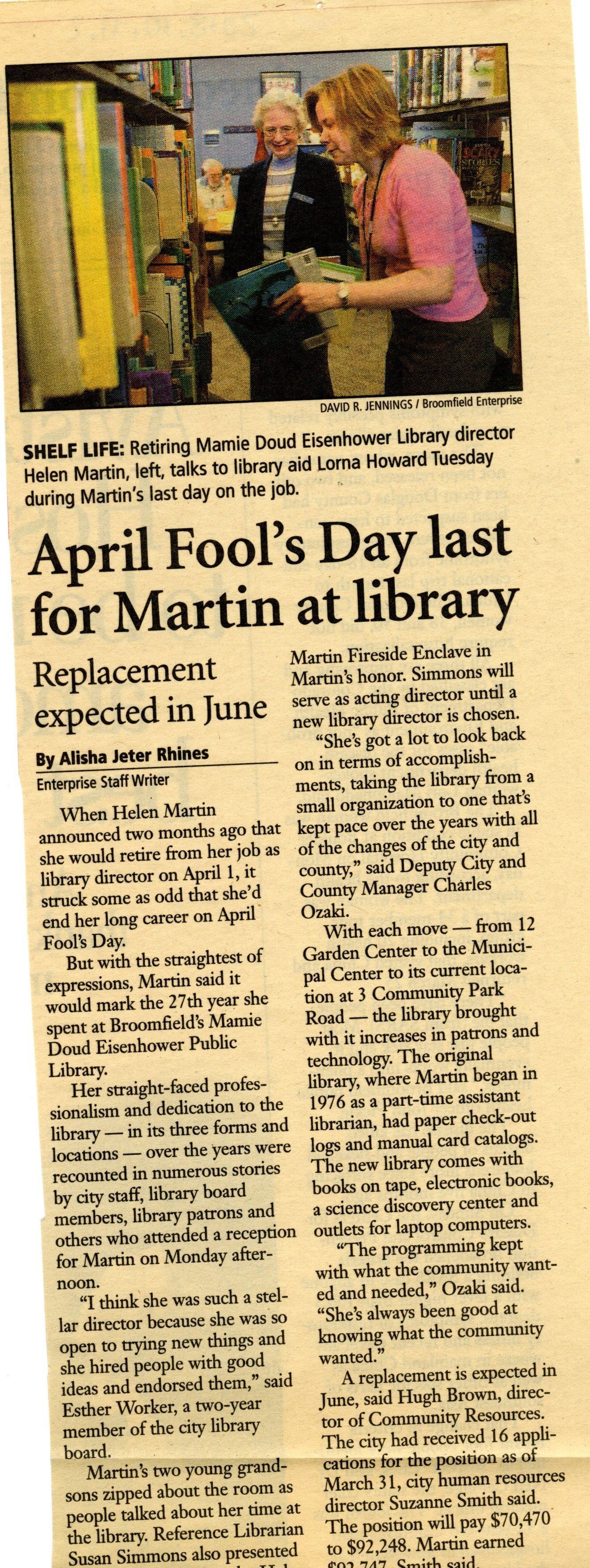 "April Fool's Day last for Martin at library" Article is about retirement of Helen Martin, Director of Mamie Doud Eisenhower Library.
