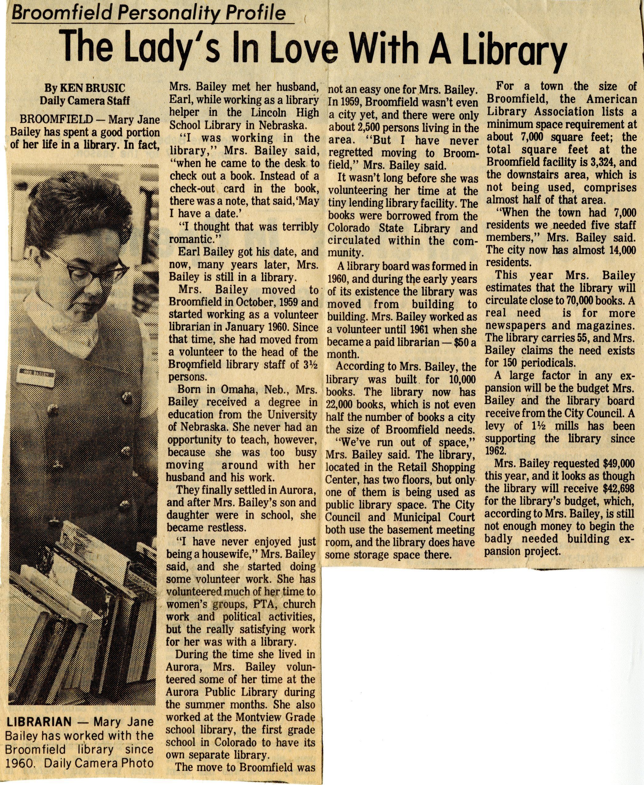 Article is about Mary Jane Bailey, a previous librarian for Mamie Doud Eisenhower Library. The article follows some of her life and her dedication to the broomfield library.