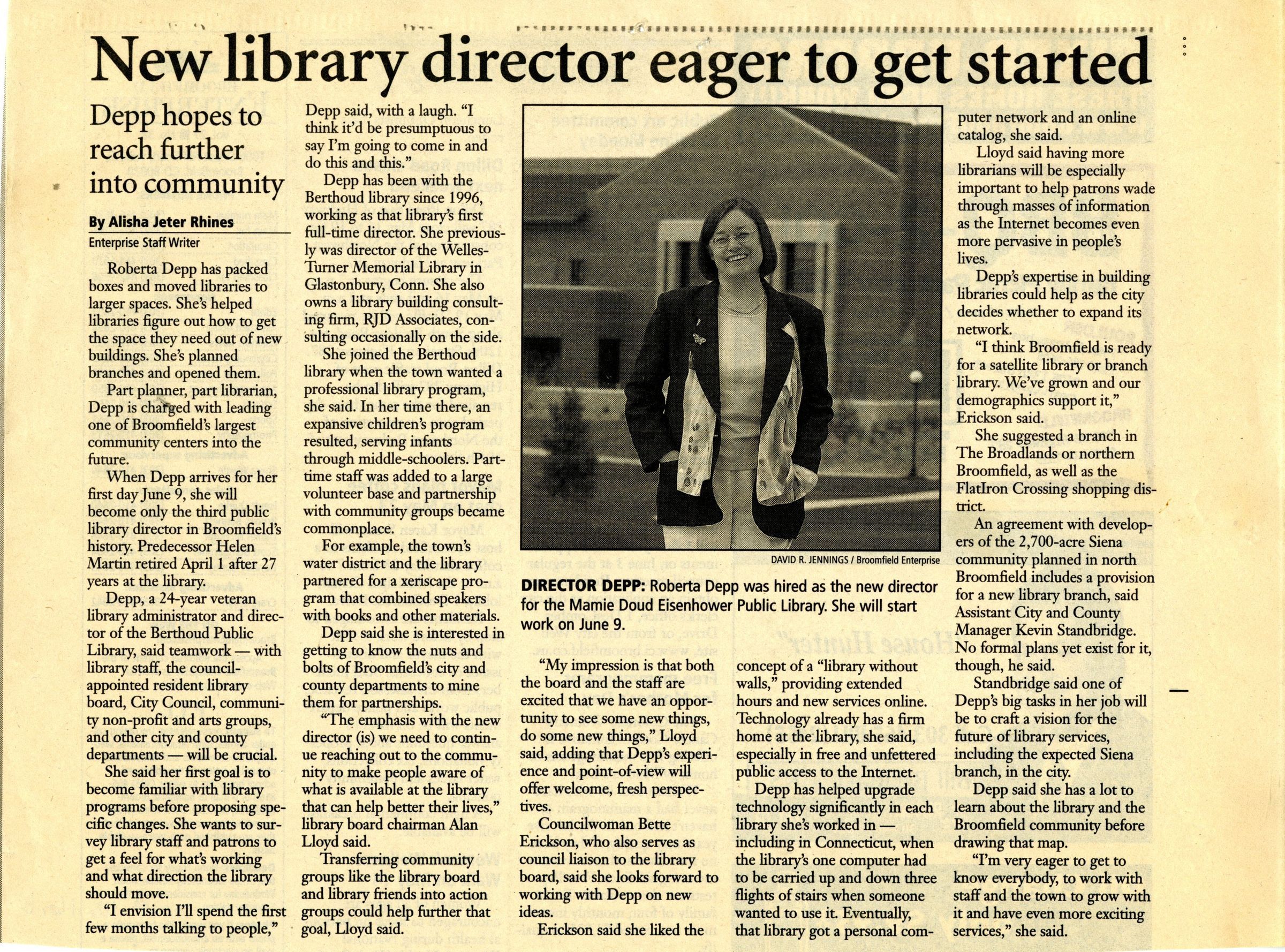 Article is about Roberta Depp, the library director for Mamie Doud Eisenhower Library. Article is cut out from Broomfield Enterprise Vol. 27 No. 38. Article goes into some detail about Depp's involvment in the community