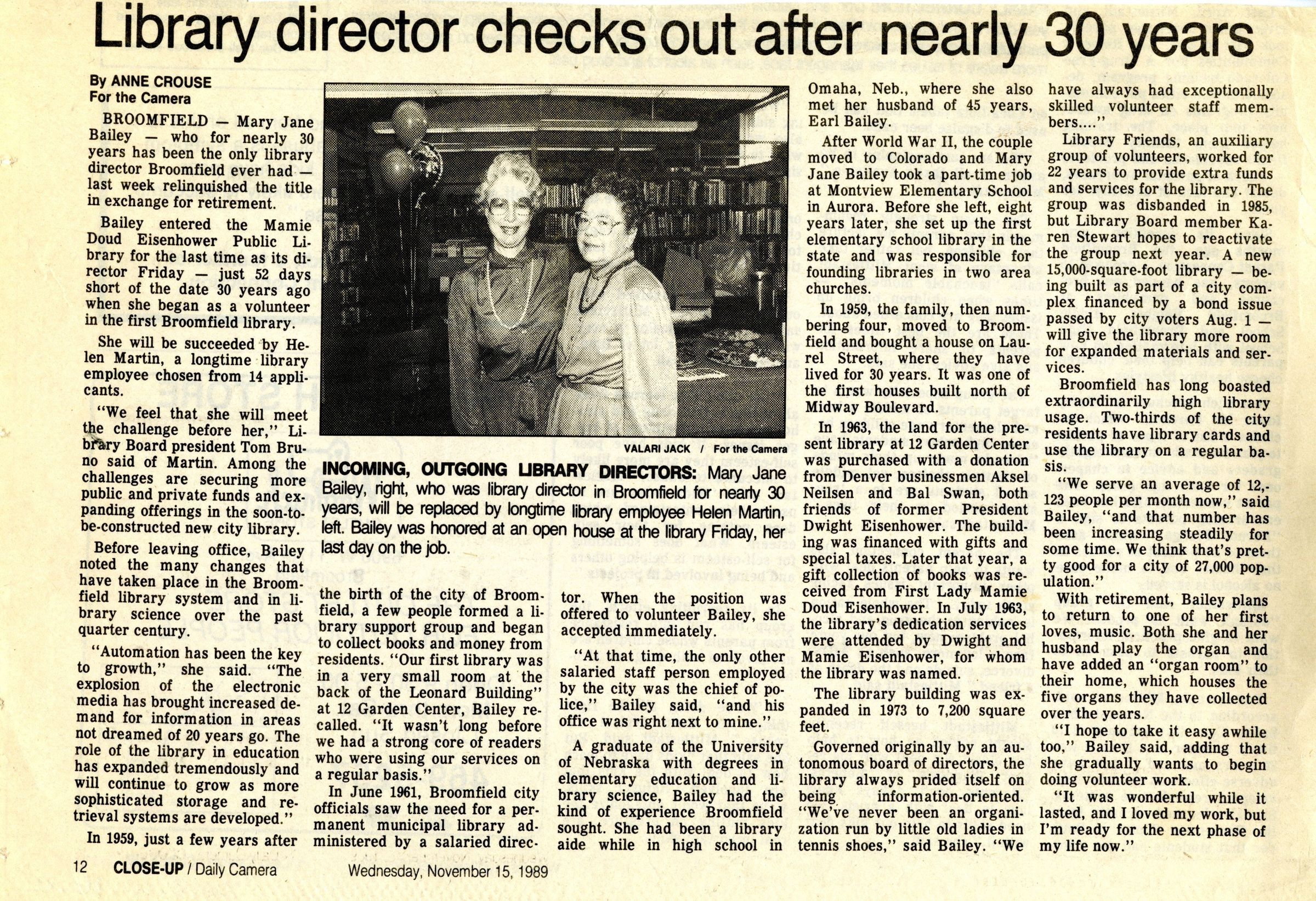 Article is about Mary Jane Bailey, a previous librarian for Mamie Doud Eisenhower Library. Article is cut out from the Daily Camera. The article talks about Bailey and her role as the only library director. Article also mentions the formation of the broomfield library.