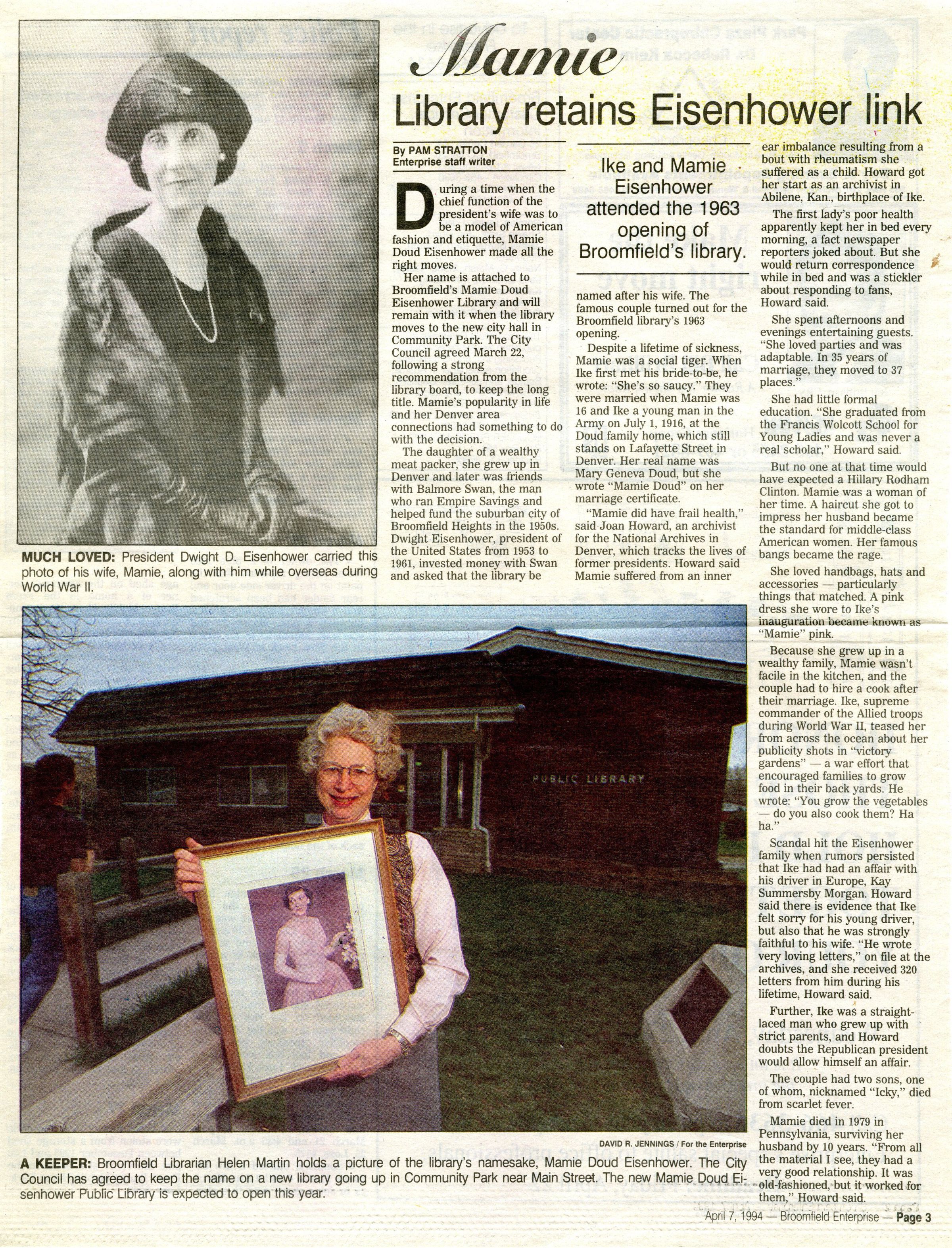 Article dut out from Broomfield Enterprise. Article is about Mamie Doud Eisenhower's link to the Broomfield Library. Newspaper printed on April 7 1994.