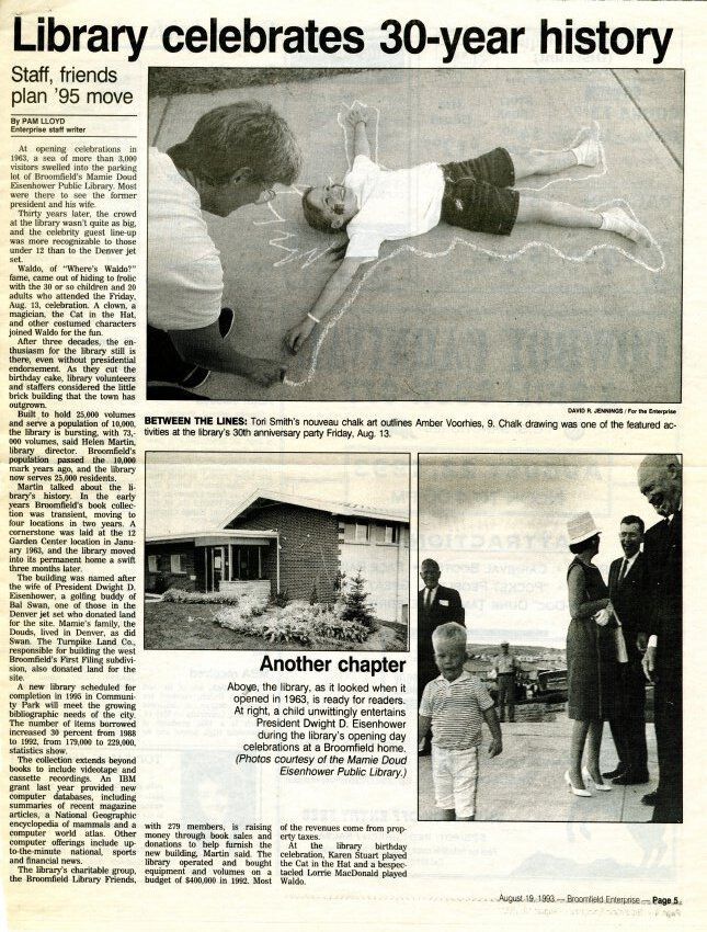 Article is cut out from Broomfield Enterprise. Article is about the 30th birthday celebration of the library and plans to move in 1995.Lexicon