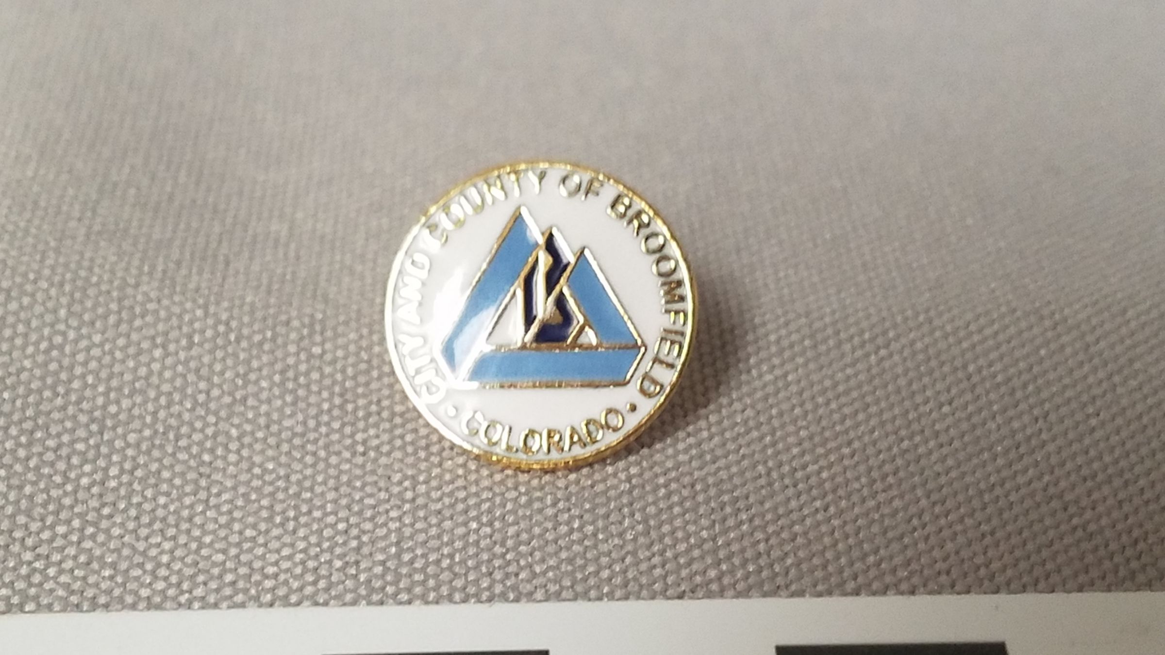 Circular pin that has Broomfield city logo on it and reads "City and county of Broomfield Colorado" on white background.Collection