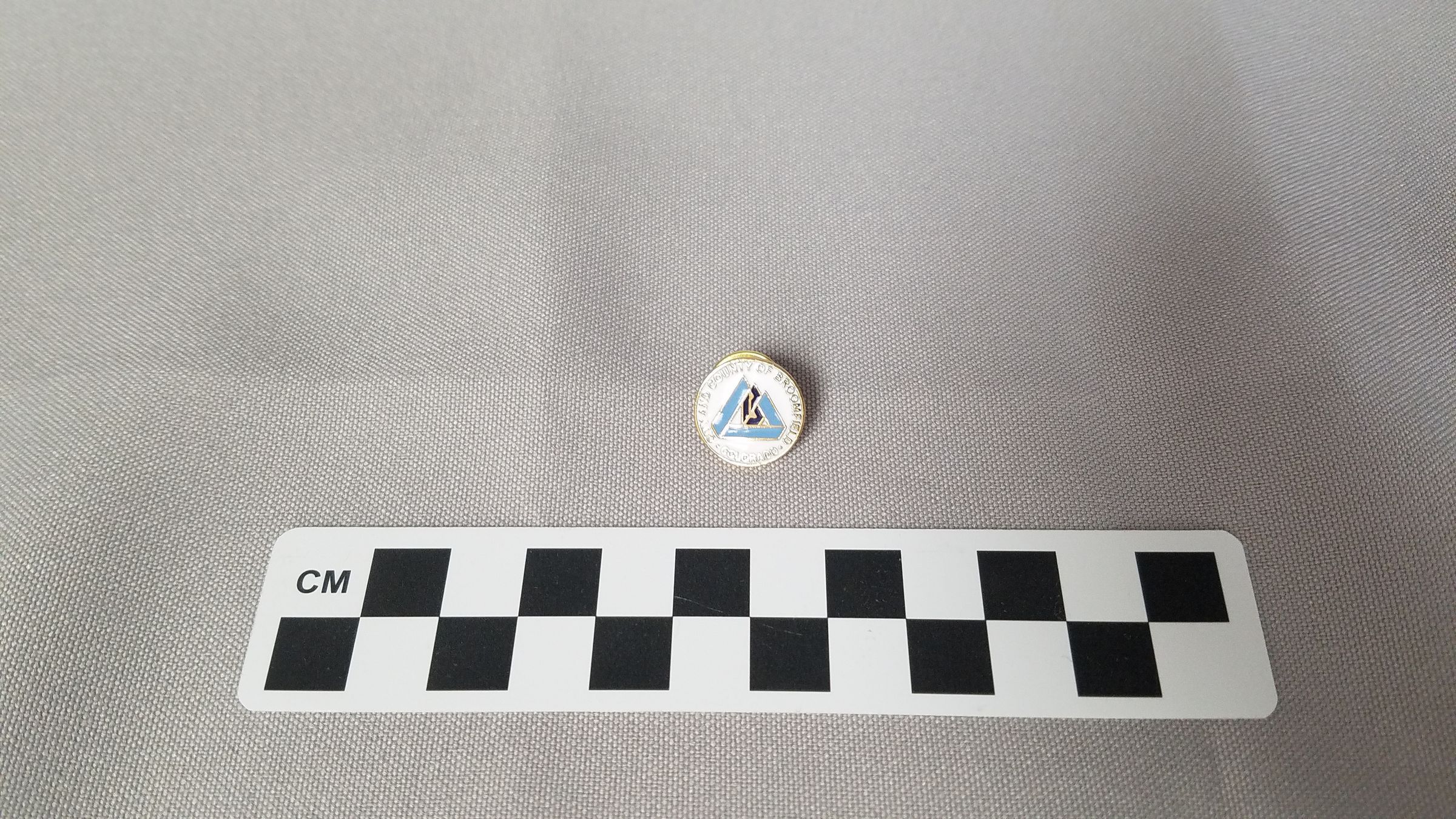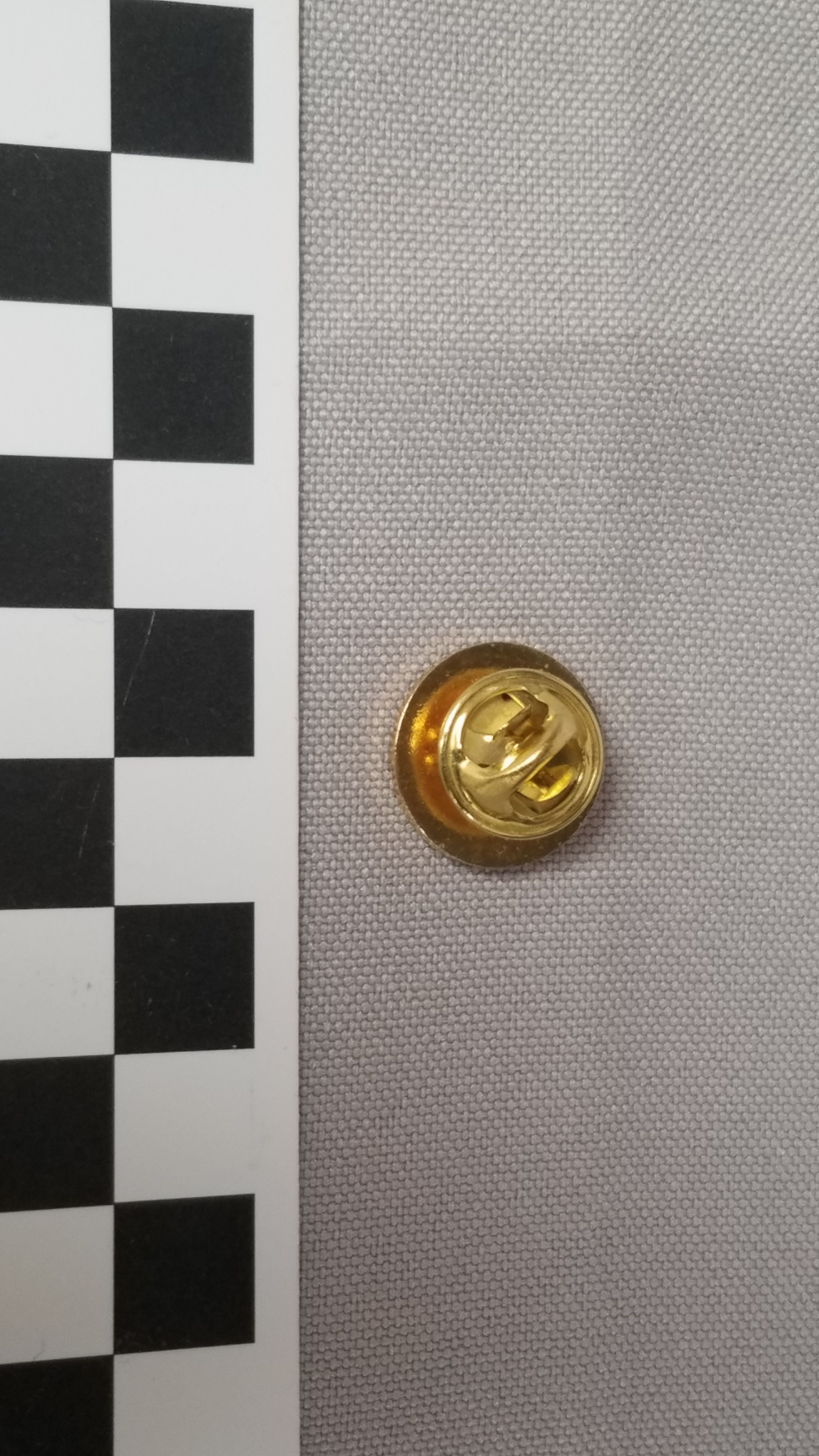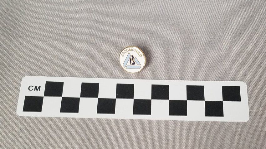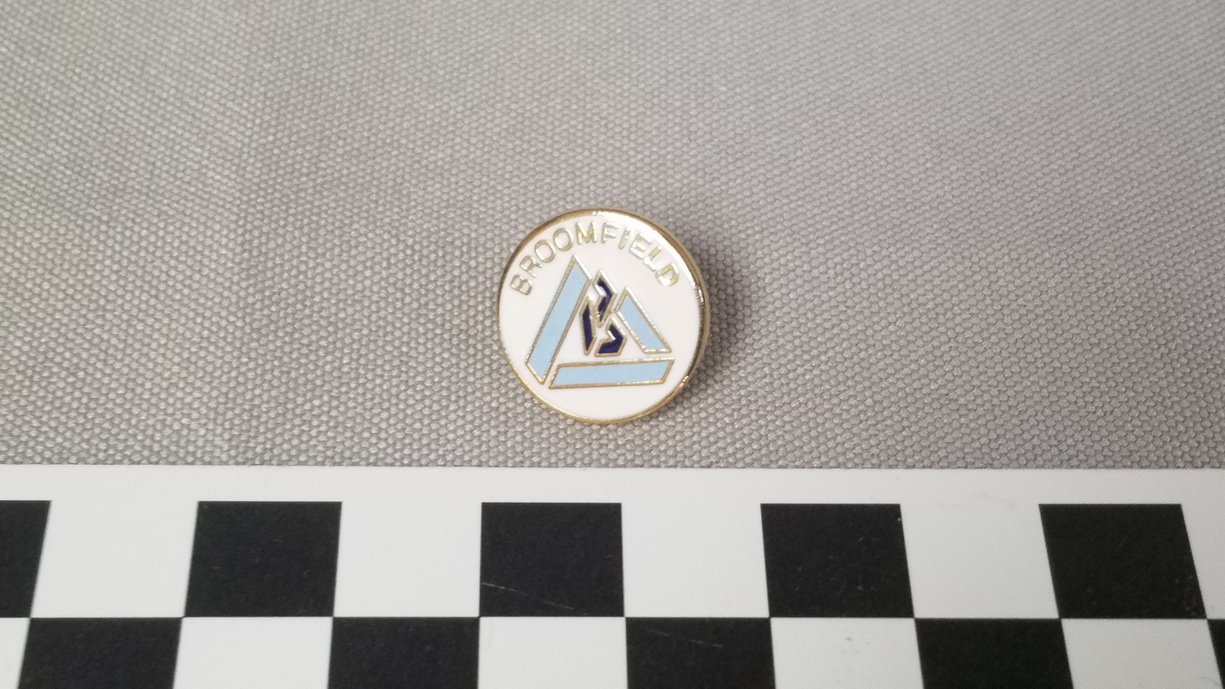 Circular pin that has Broomfield city logo on it and reads "Broomfield" on white background.Collection