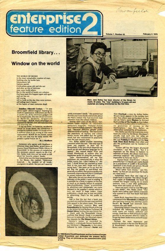 Article is cut out from Broomfield Enterprise. Article is about the history of the Broomfield LIbrary and Mary Jane Bailey. Above image on top right there is the identification Volume 1, Number 43Lexicon