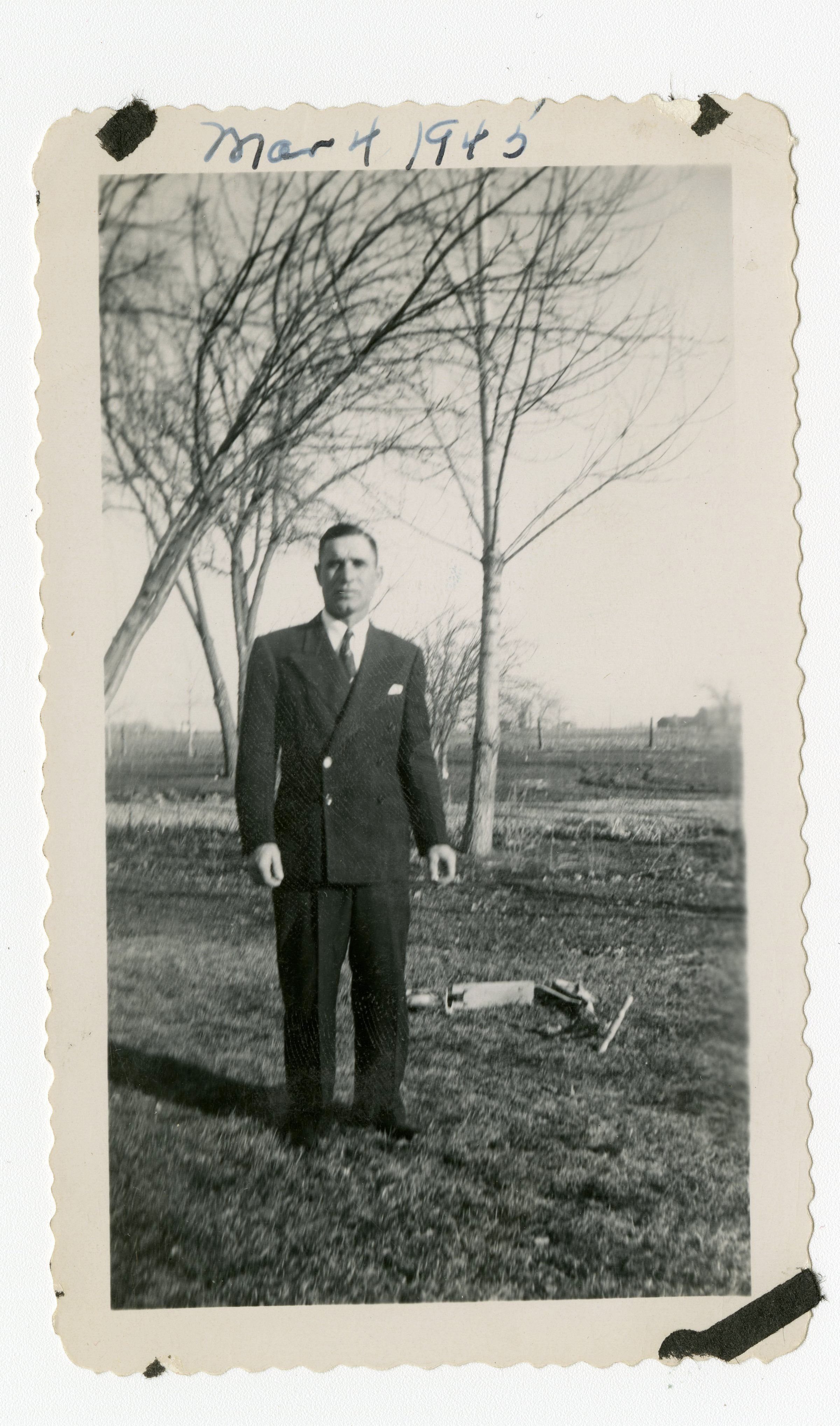 Black and white photograph of Lester C Brunner. He is wearing a dark suit. Photograph is taken outside. There is a scooter on the ground behind and to the right of him. Written above the photograph is "Mar 4, 1945."