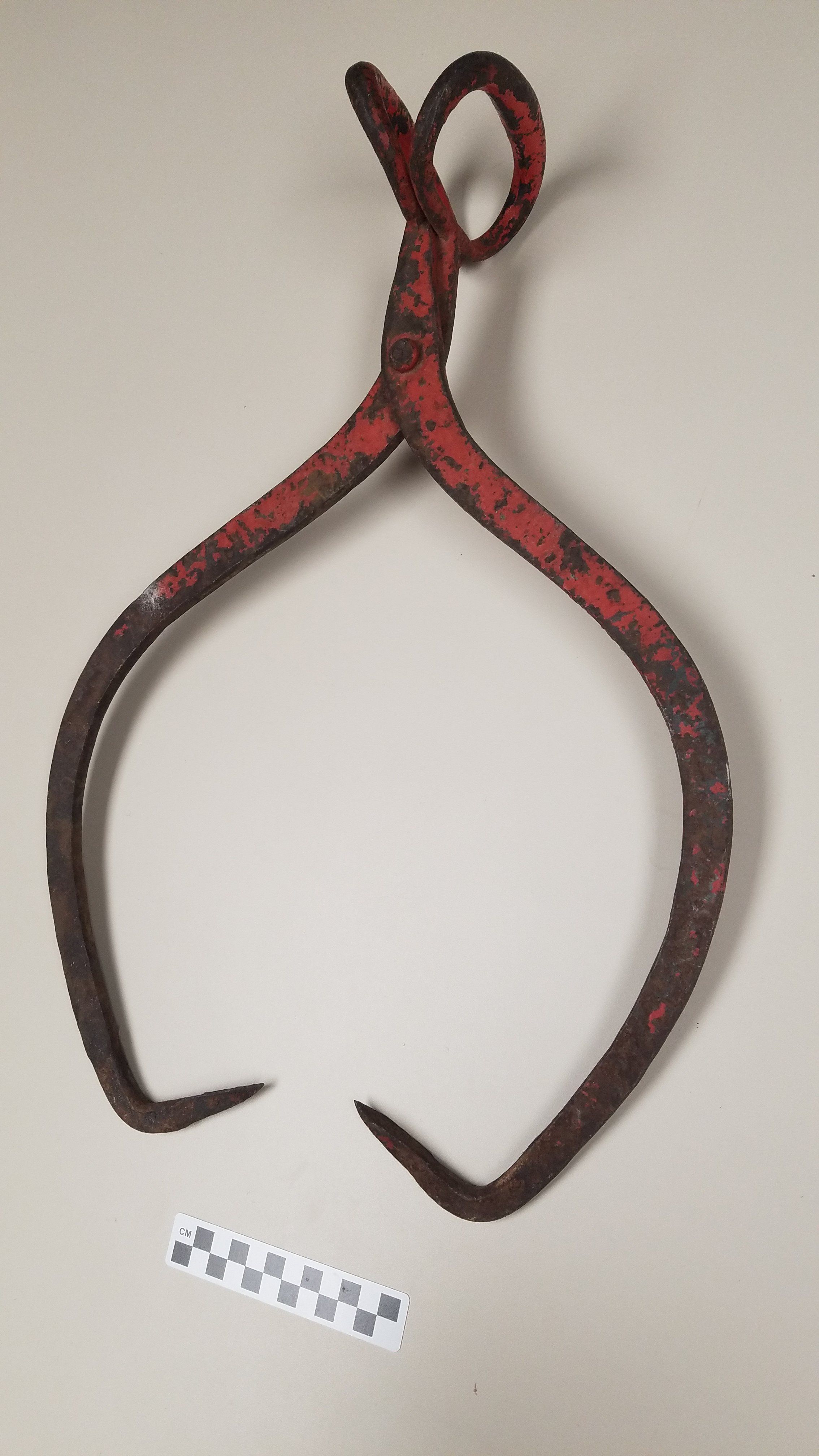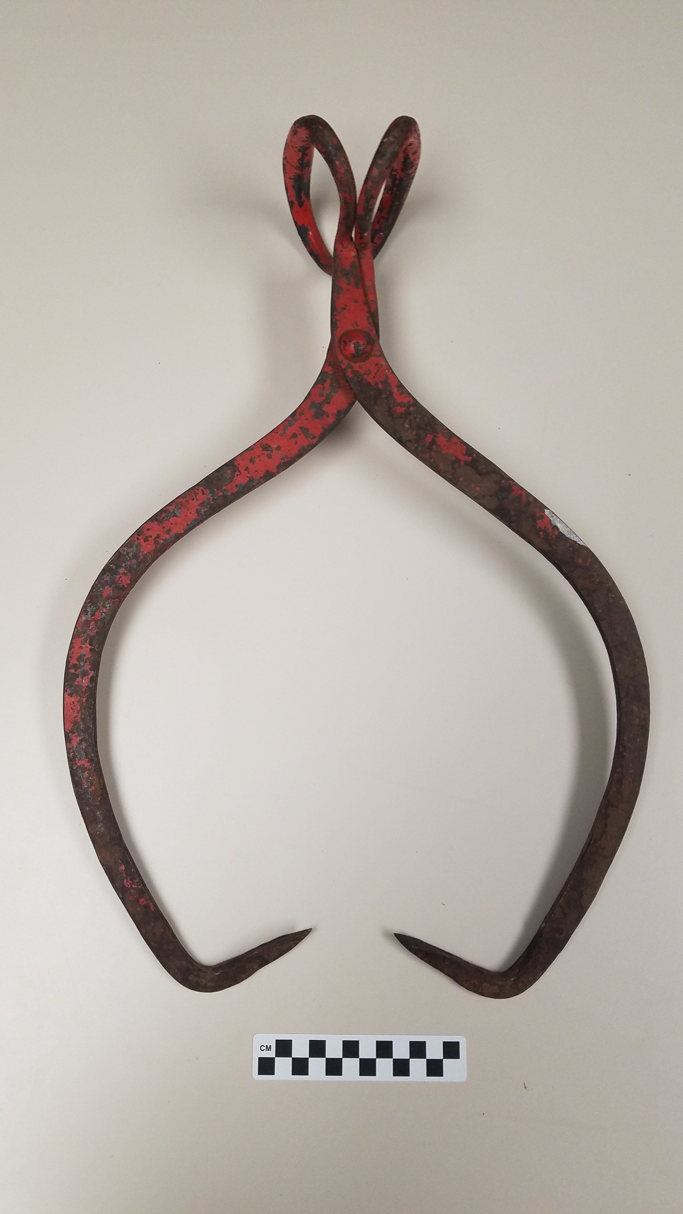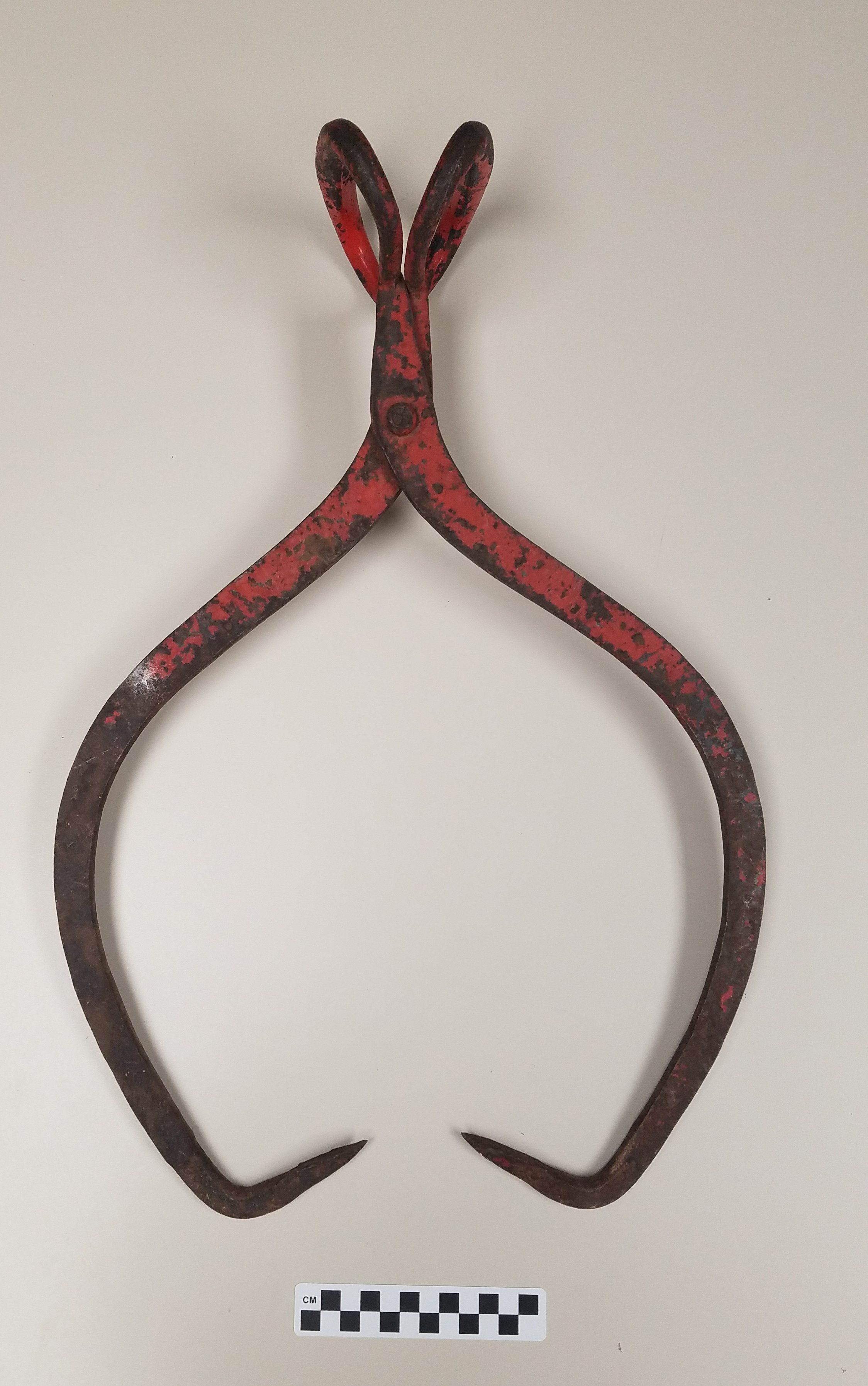 Pair of large ice tongs painted red (although the paint is now chipped away throughout).