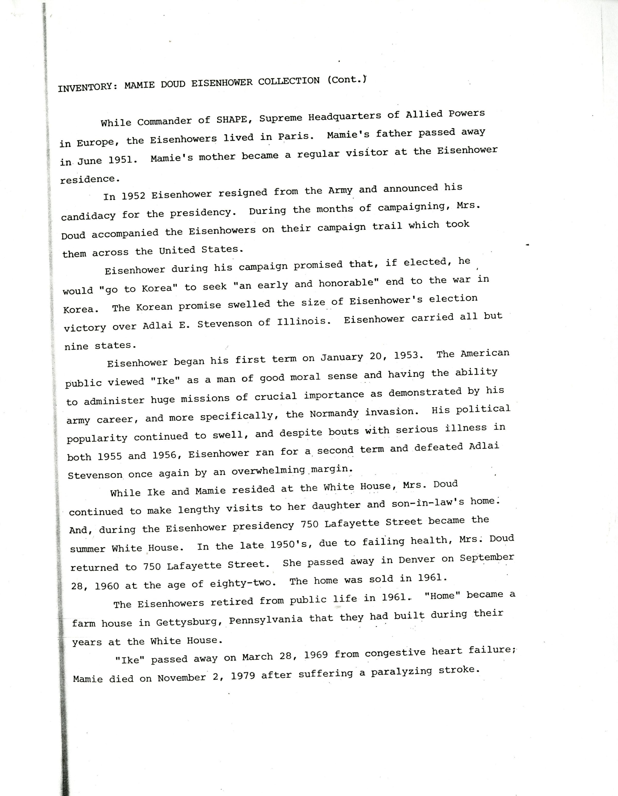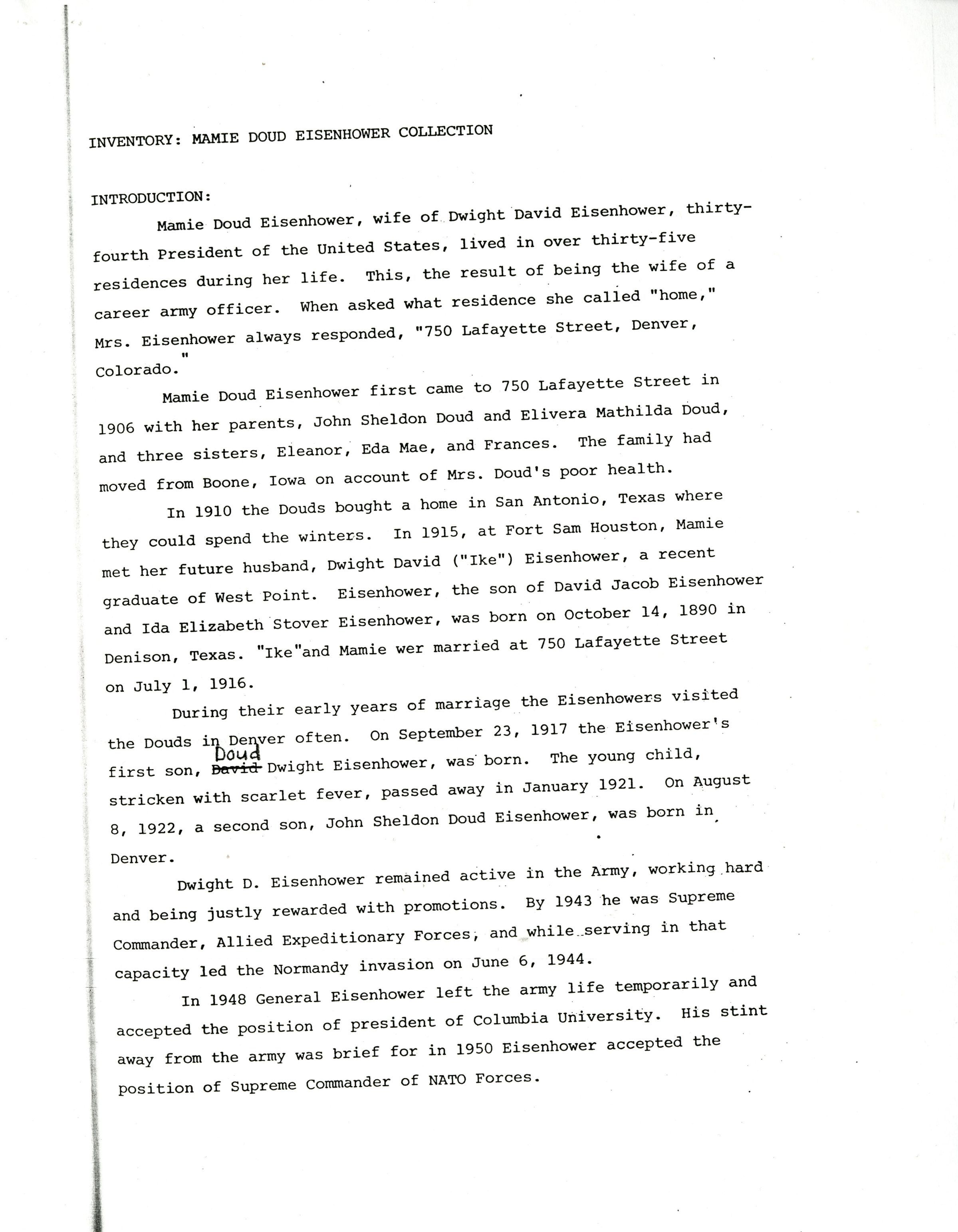 Document is a history of the Mamie Doud Eisenhower Library written by the Colorado Historical Society