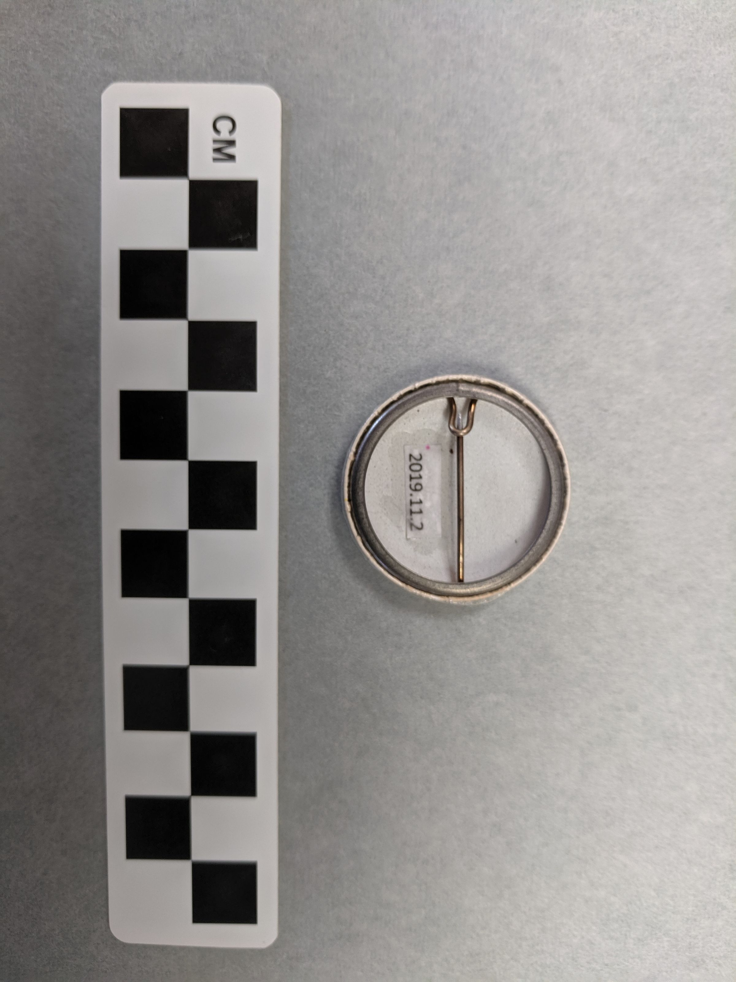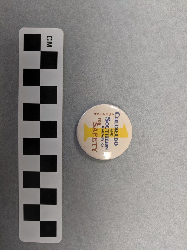 Approx 1.25" in diameter. Cream color with a yellow 1 printed on it with a text overlay. There is blue and brown text. Blue text reads: "Colorado and Southern Railway Co." Brown text reads: "Campaign for Safety." The back of the botton is hollow and has a straight pin for fastening inside.Collection