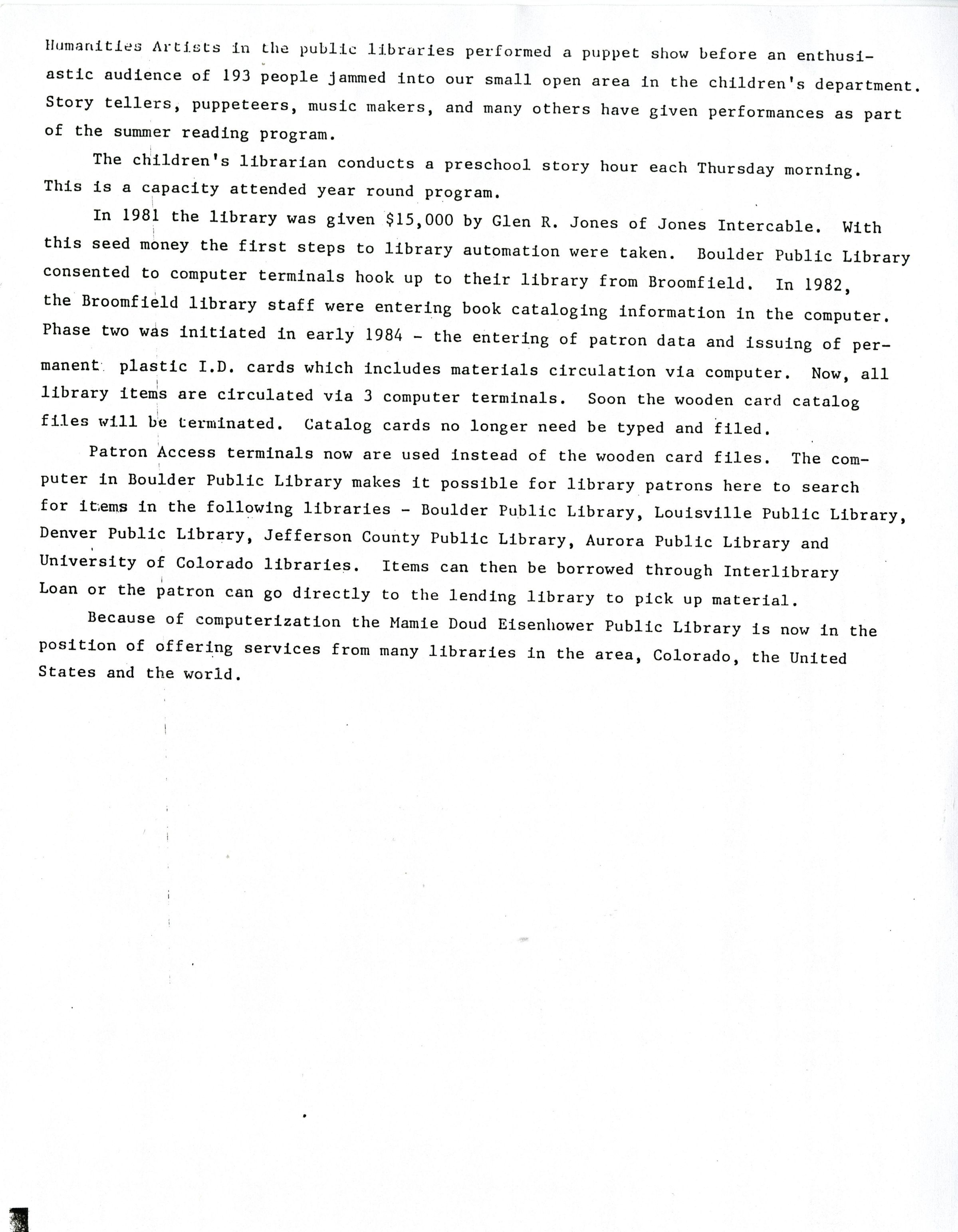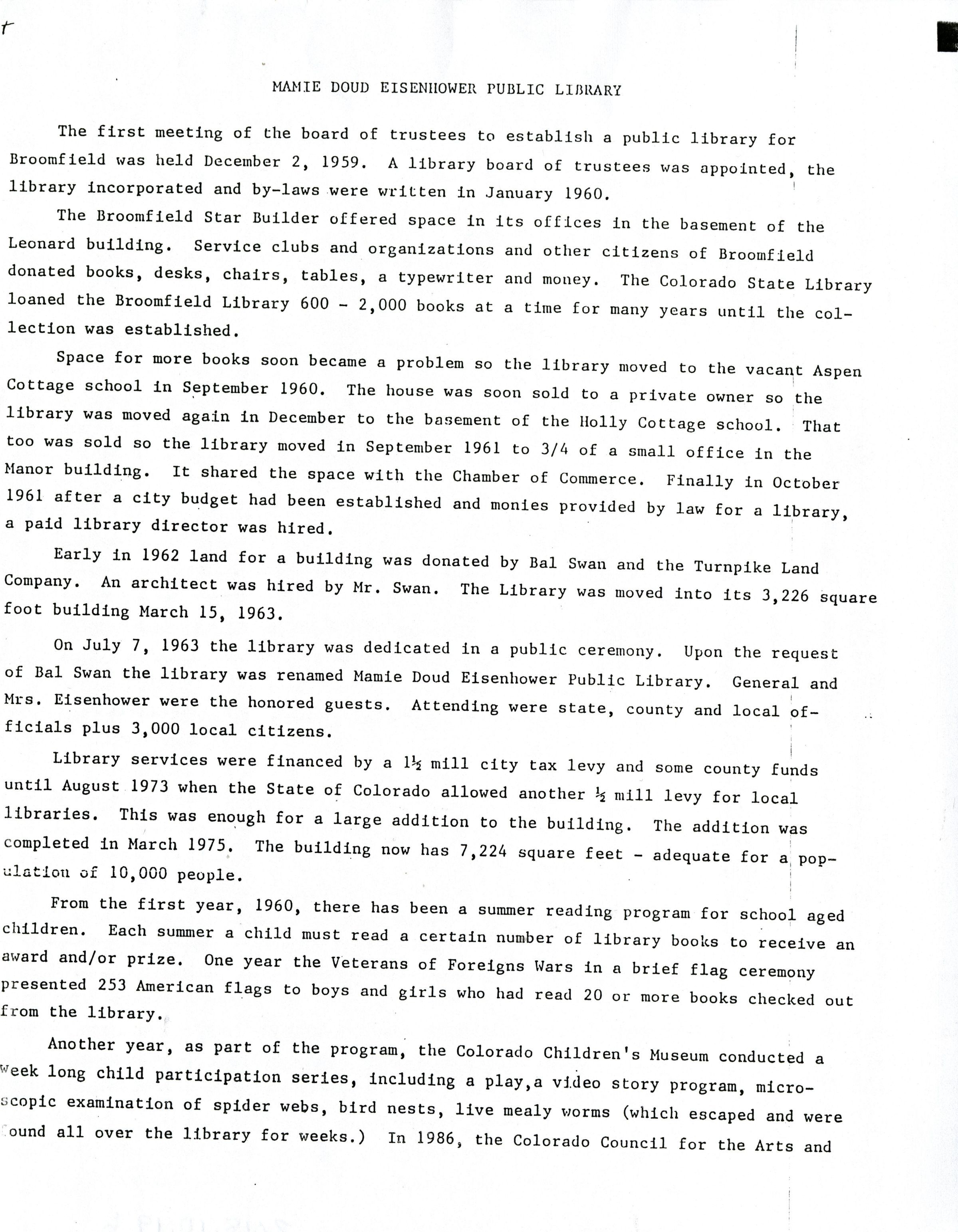 Document is about the history of the Mamie Doud Eisenhower Public Library in Broomfield. date not present.