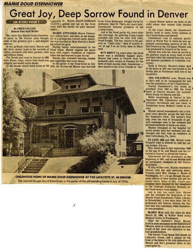 Article is about the history of Mamie Doud Eisenhower, her connection to Denver and her death.Lexicon