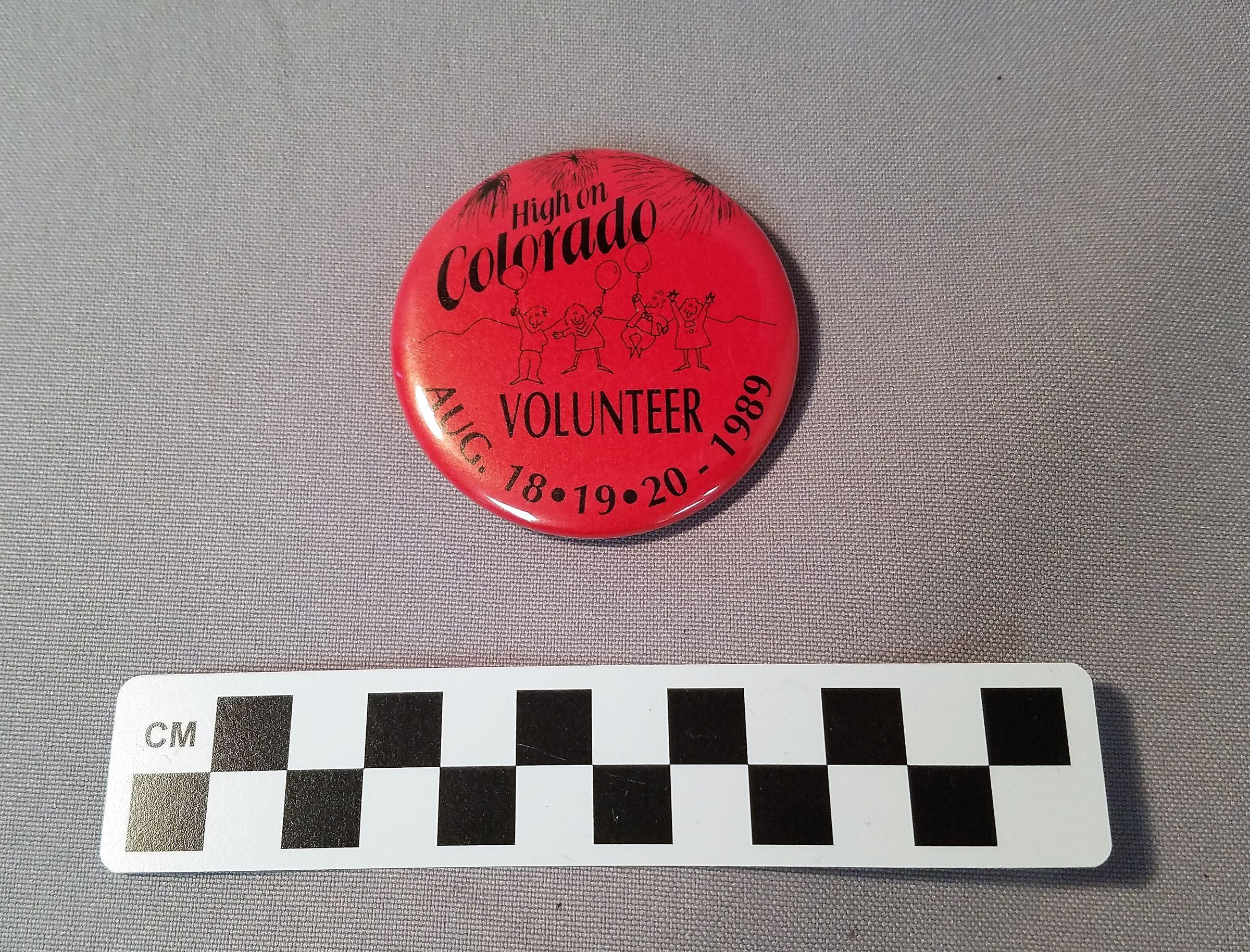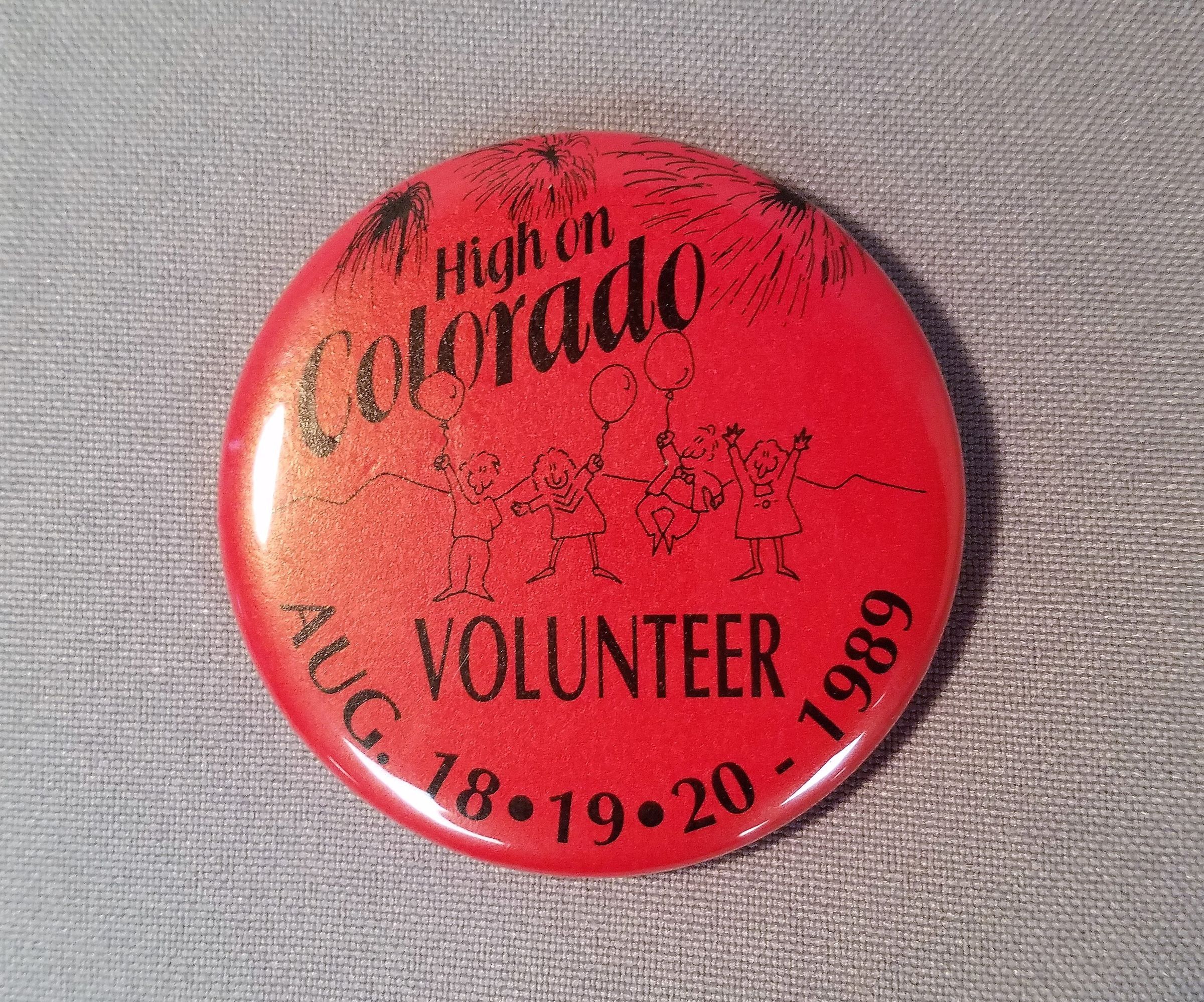 Metal promotional button with safety pin on back. Text reads "High on Colorado / Volunteer / Aug. 18, 19, 20 - 1989" - text is in black, and the button is dark orange in color. On the front at the top is a sketch of fireworks (in black) and in the middle is a line drawing of four people in front of a jagged horizon line (also done in black). Three of the people are holding balloons.Collection