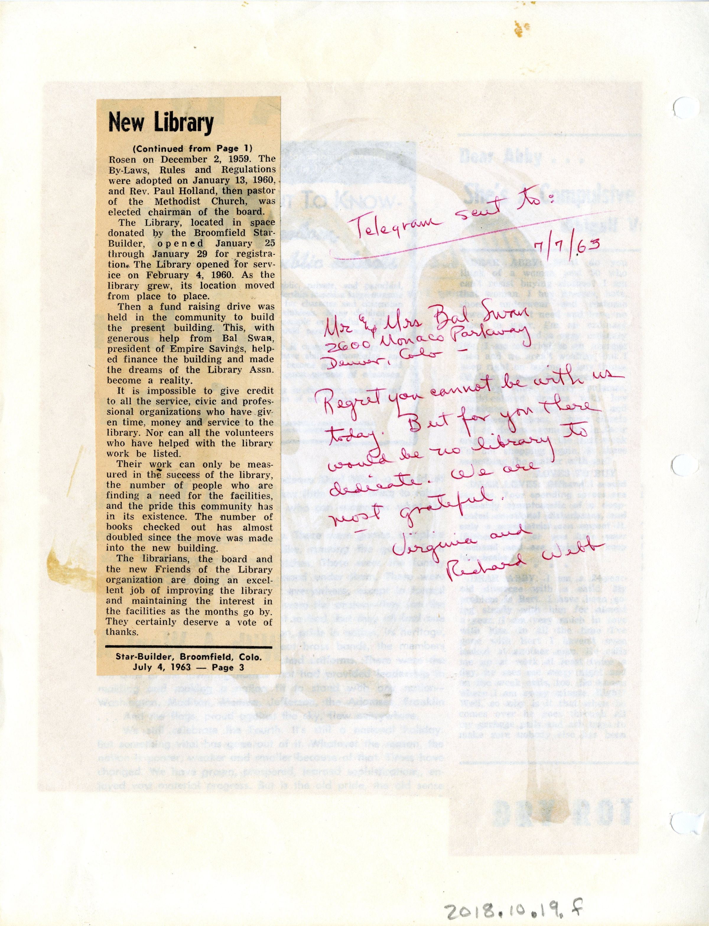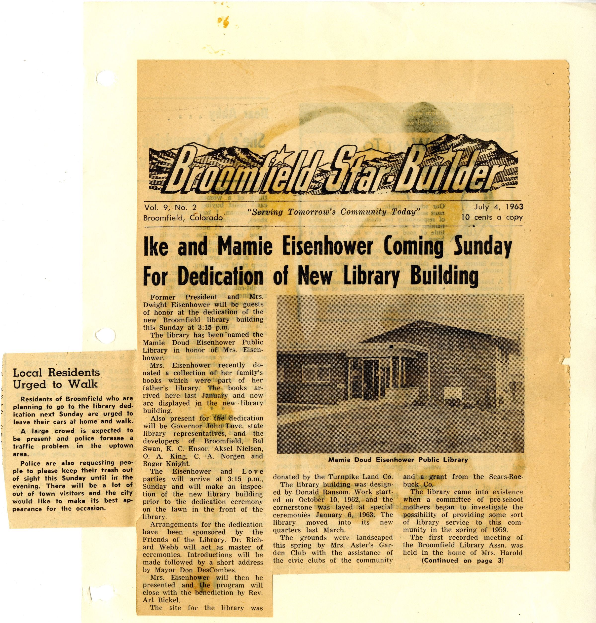 Newspaper clipping is cut out from The Denver Post and pasted/taped onto front and back of paper. Article is about the dedication of the Broomfield Libary with Mamie Doud Eisenhower.