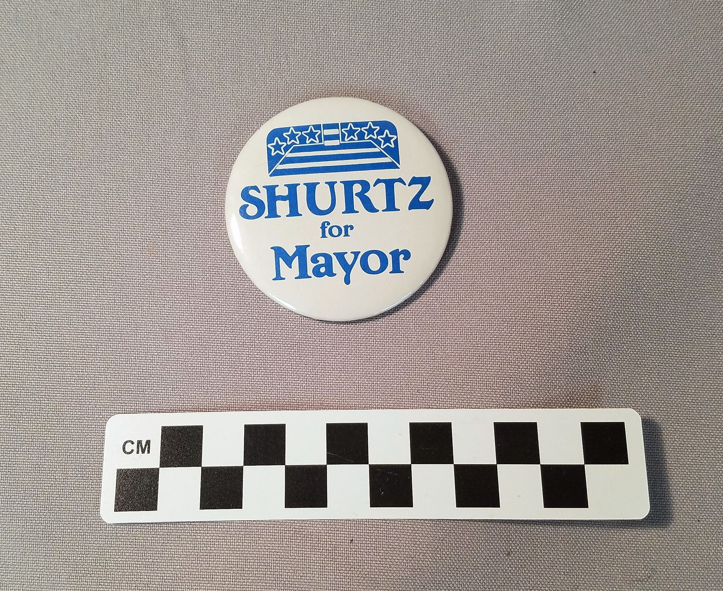 Metal button reading "Shurtz for Mayor". The button is white with text in blue on front and has a safety pin on the back. Also on the back is a white sticker with red text that reads "Created By: DESIGN GRAPHICS / P.O. Box 574, Broomfield / Colorado 80020 / (303) 466-0684". At the top of the pin on the front is a design in blue and white of stripes and 6 stars.
