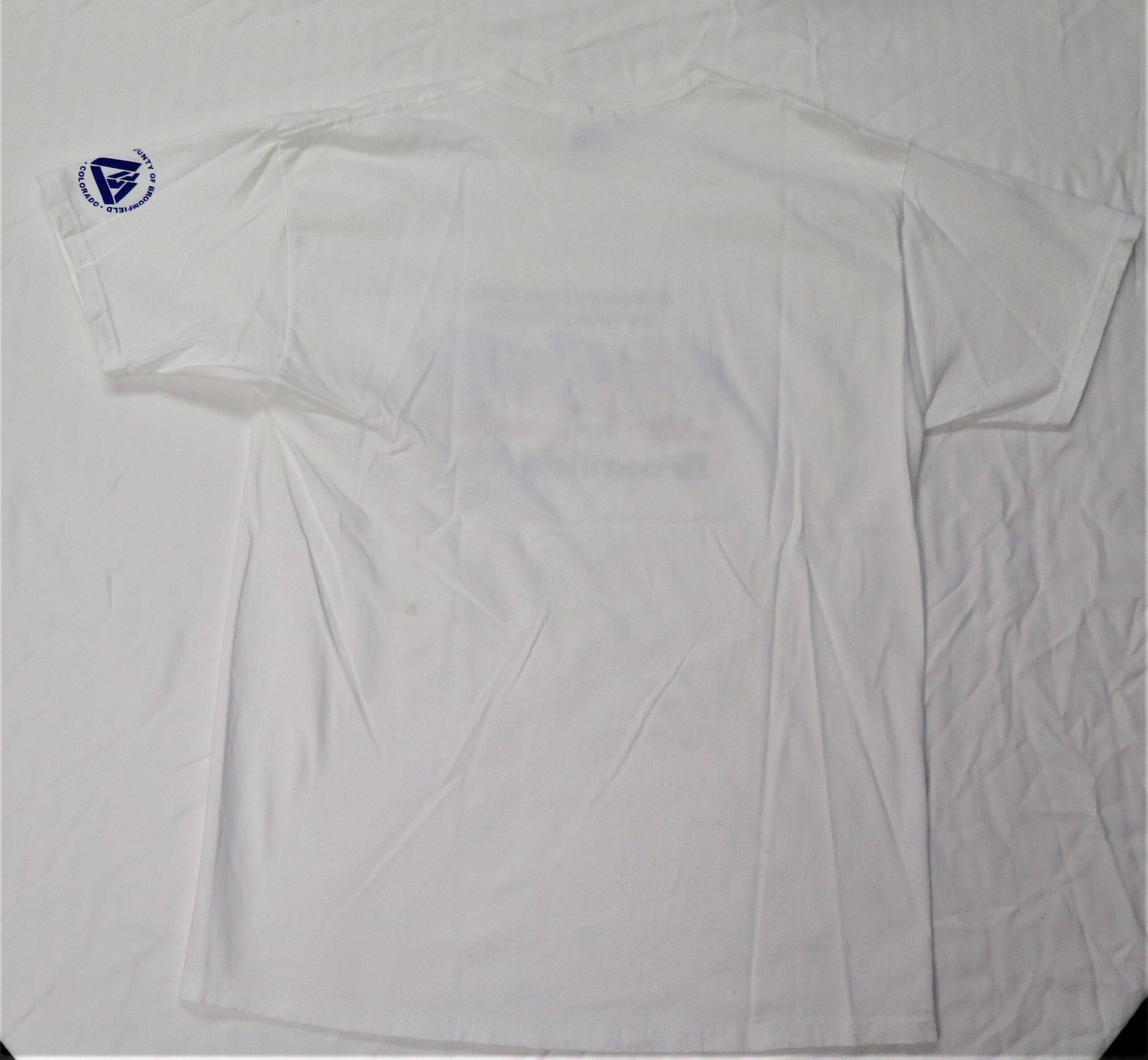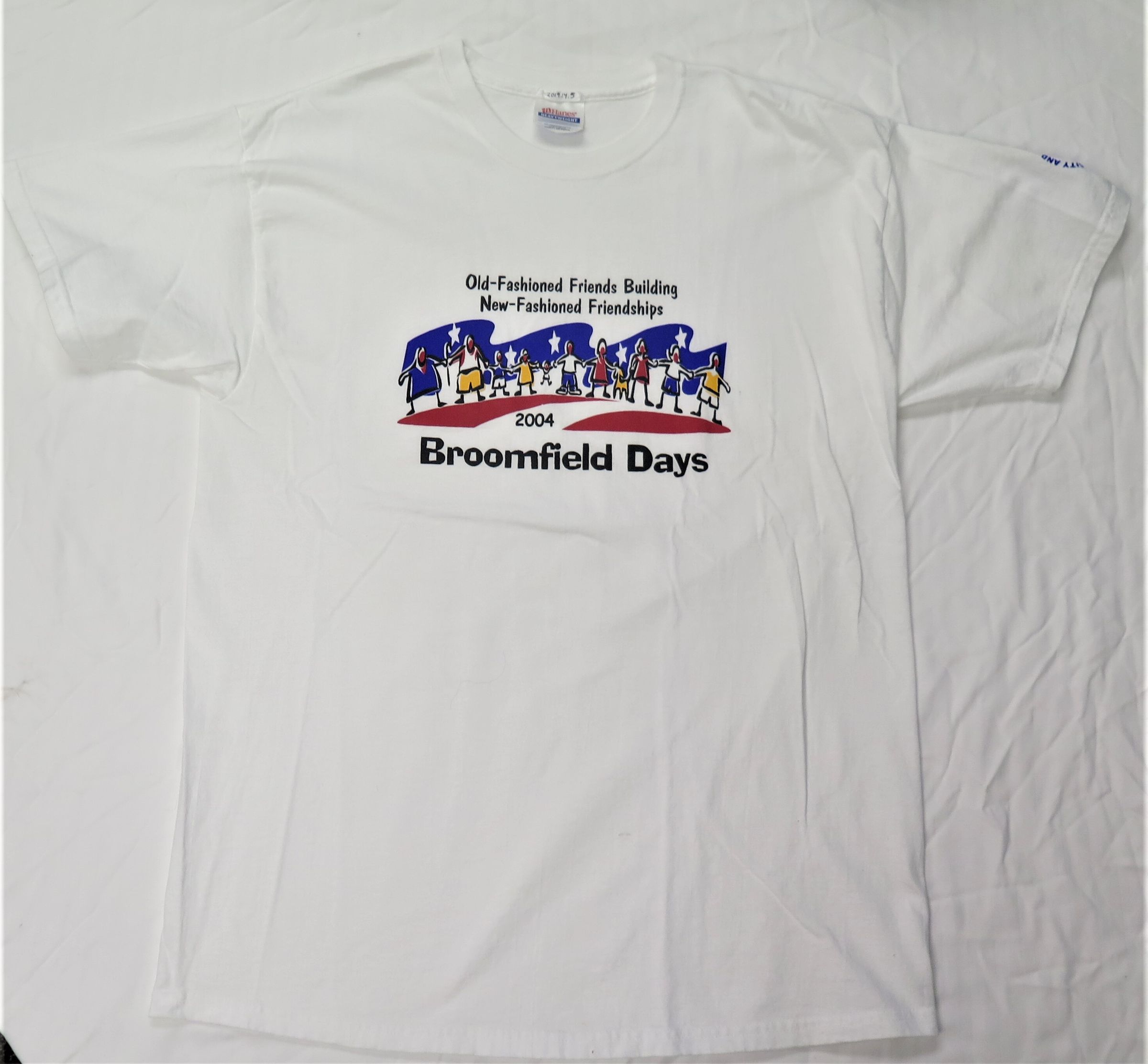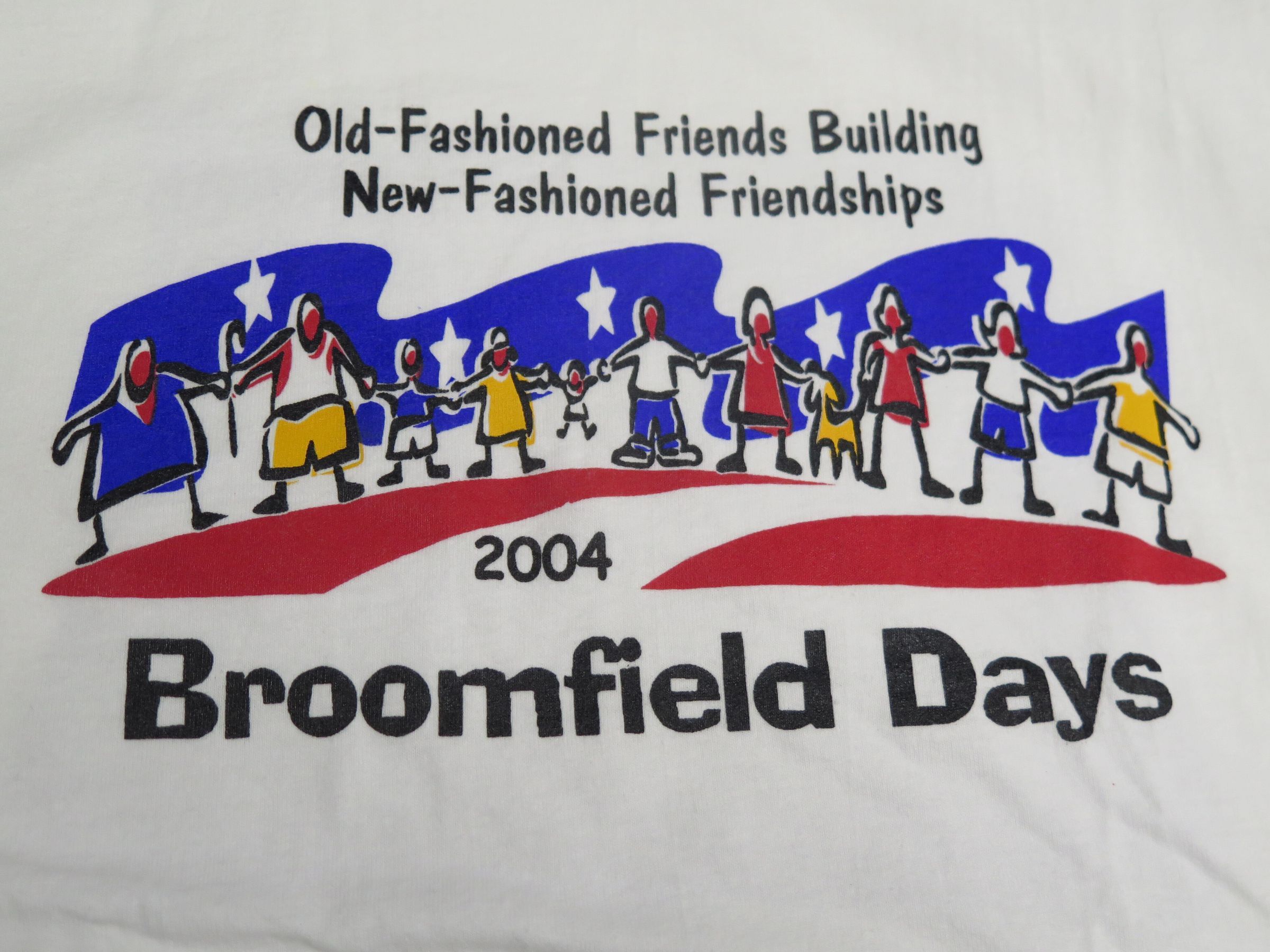 2004 Broomfield Days T-shirt, Large, white logo Broomfield Days and "Old-fashioned friends Building New-fashioned friendships" logo people holding hands City and County of Broomfield logo on left sleeve